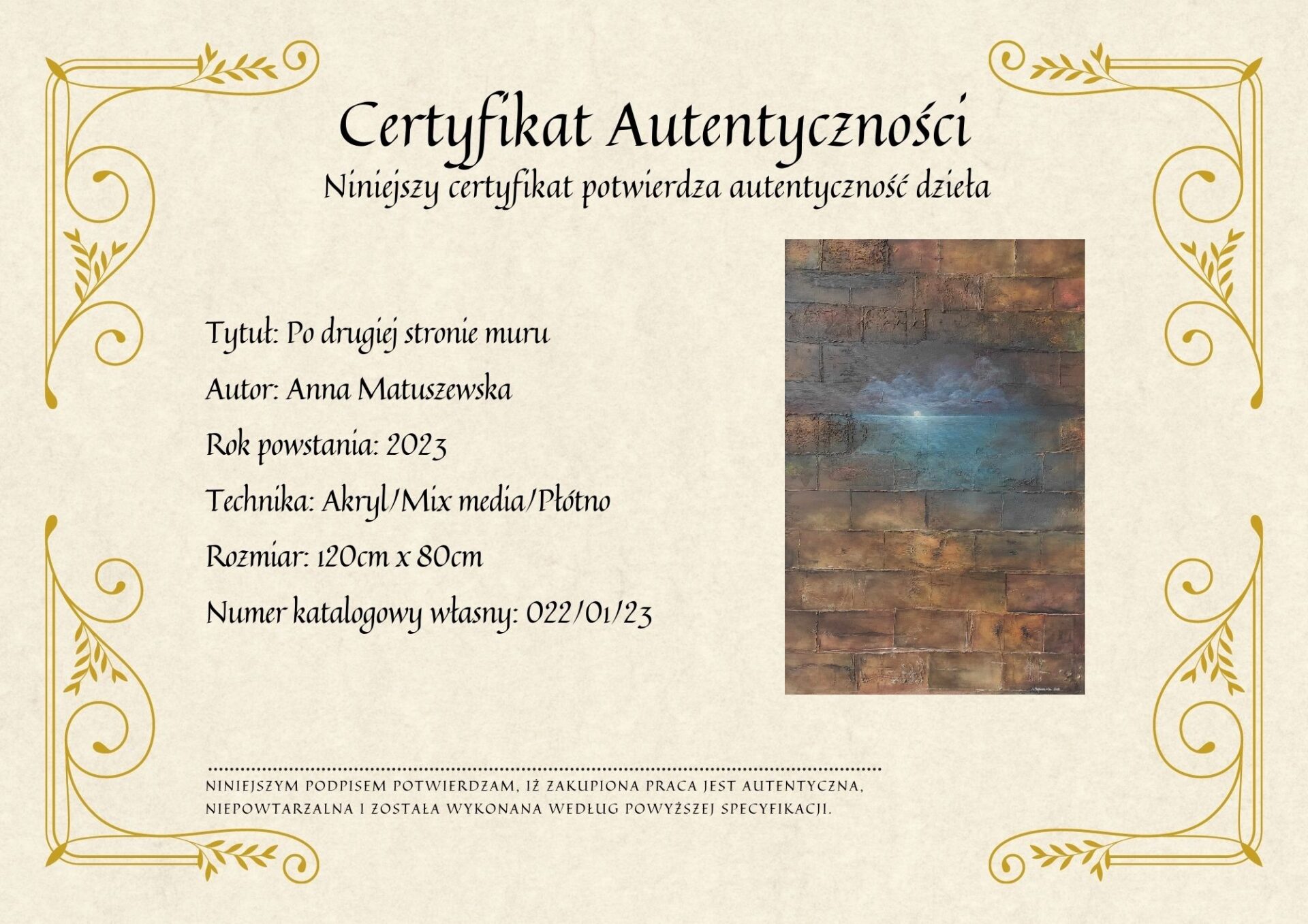 Do obrazu, dołączony zostanie Certyfikat z podpisem autora, potwierdzający autentyczność dzieła.