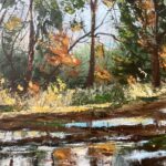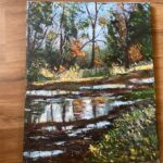Jesienią zeszłego roku wybrałam się na spacer z psem po rzęsistej ulewie. Podmokłe już i tak ścieżki zmieniły się w jeziorka. Zafascynowały mnie odbicia kolorowych liści i rozpogodzonego nieba w kałużach.
