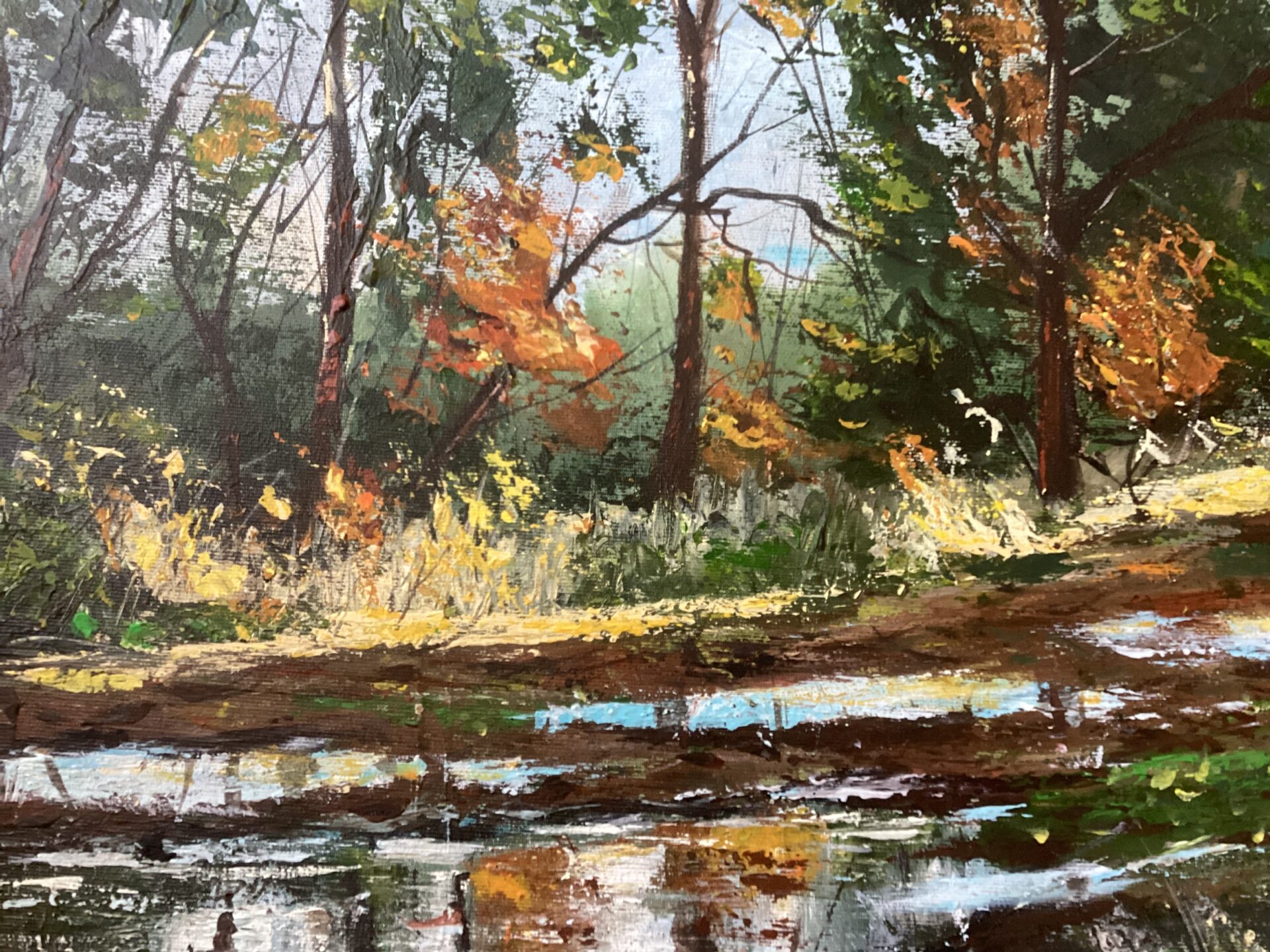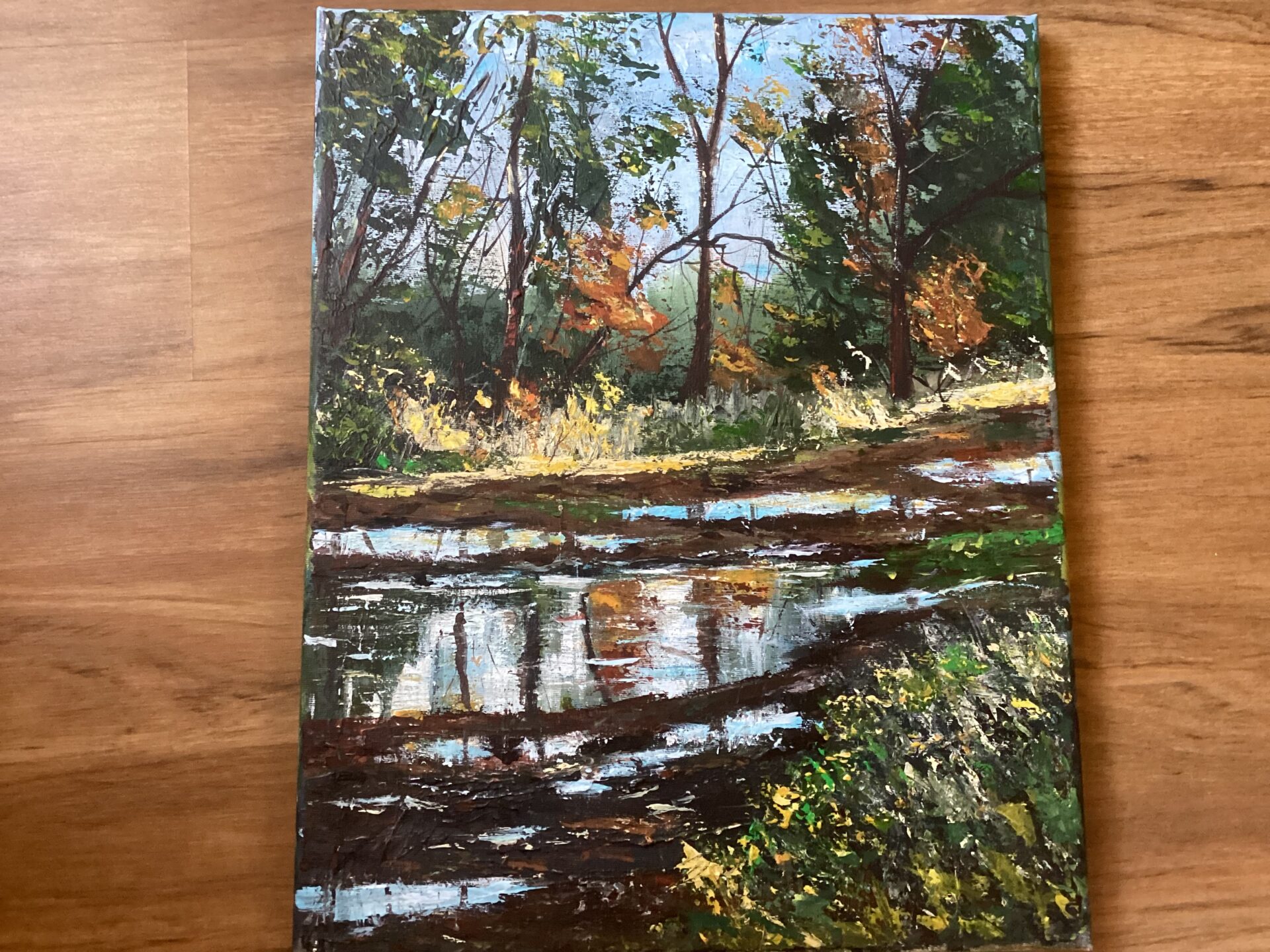 Jesienią zeszłego roku wybrałam się na spacer z psem po rzęsistej ulewie. Podmokłe już i tak ścieżki zmieniły się w jeziorka. Zafascynowały mnie odbicia kolorowych liści i rozpogodzonego nieba w kałużach.