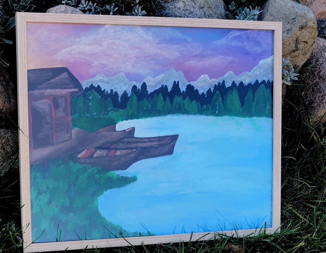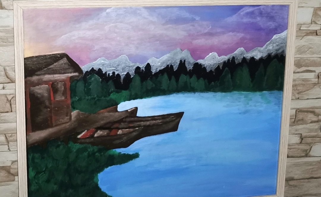 Obraz oprawiony w ramę, wykonany farbami akrylowymi