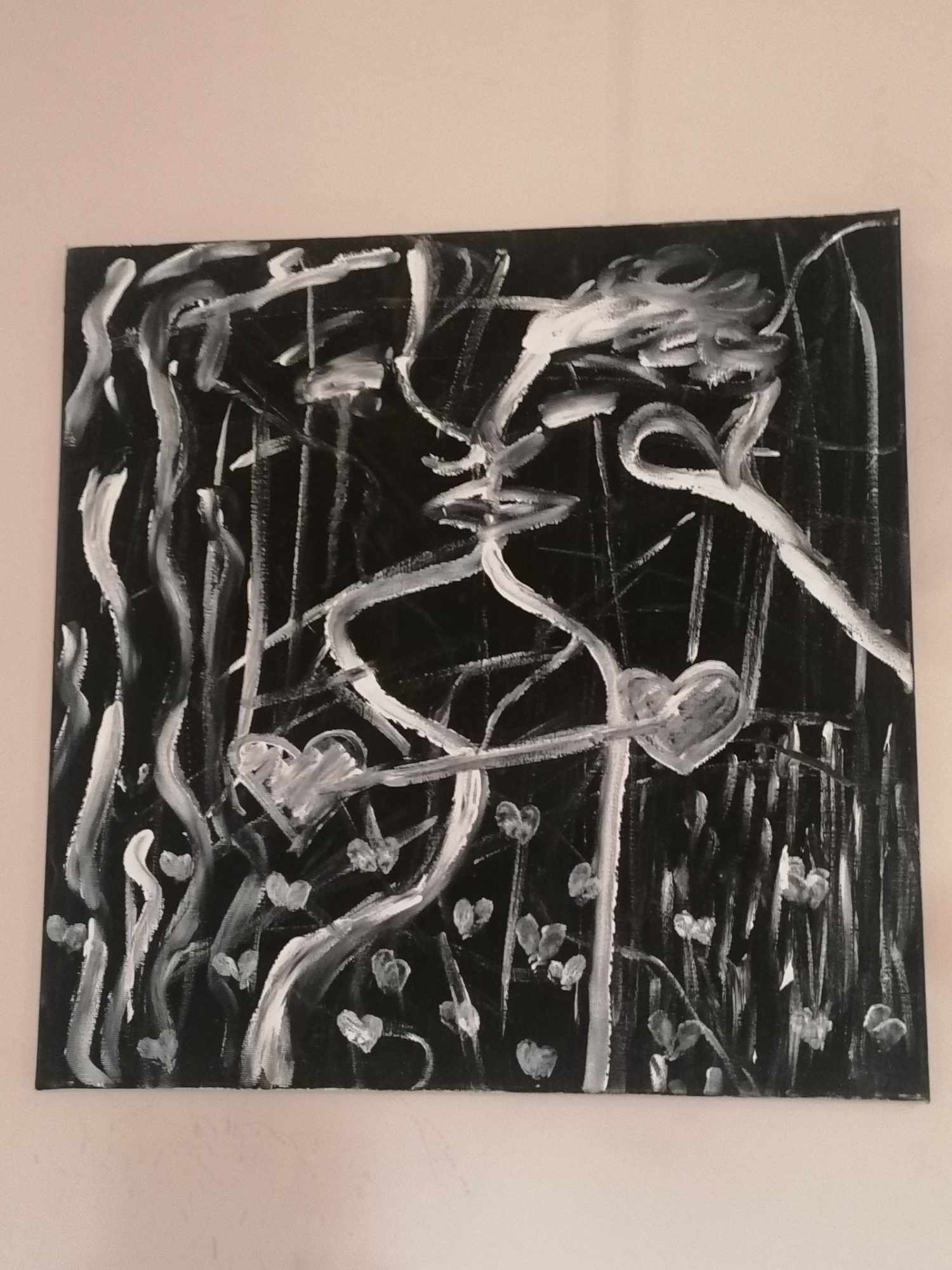 Obraz monochromatyczny, abstrakcyjny. Wykonany farbami akrylowymi na płótnie. Inspiracją było nieszczęśliwe doświadczenie miłosne. Abstrakcja ukazująca wiele uczuć i emocji przyjemnych z nieprzyjemnymi tworząc harmonię. Obraz ma wymiary 50x50cm.