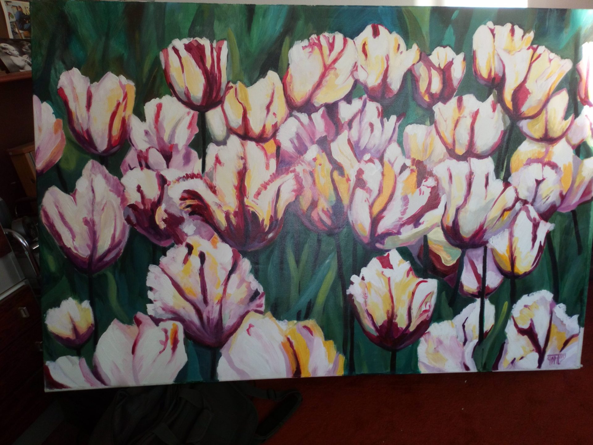 Kwiaty – „Motywy roślinne, jak i zatopione w świetle słonecznym pejzaże są moimi ulubionymi tematami. Zręcznie łączy w harmonię barw i kształtów impresjonistyczne środki wyrazu z realistycznymi elementami wyczarowując romantyczny świat pięknej egzystencji. Moje obrazy nie są żadną kopią czy fotografią przyrody. Są jej subiektywną modyfikacją, wytworem wyobraźni inspirowanej naturą. Grą harmonijnie dopasowujących się wzajemnie jasnych, świetlistych barw i kształtów wzbudza podziw i afirmację dla piękna oglądanej jego oczami przyrody. To sztuka nasycona zmysłowością i radością życia”