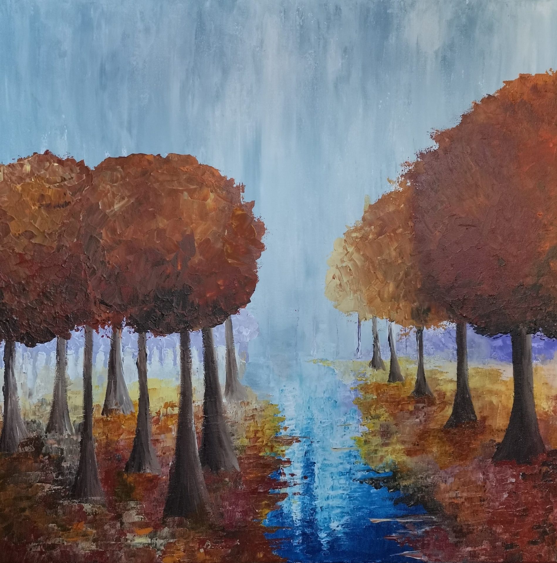 Obraz malowany farbami akrylowymi na podobraziu malarskim, boki zamalowane, obraz zabezpieczony werniksem. Jego wymiary to 60×60 cm.