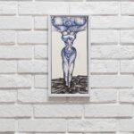 Górna część postaci rozszerza się w nietypowy sposób, tworząc coś na kształt rozłożystych ramion lub skrzydeł, które obejmują przestrzeń nad nią. Ta część grafiki może symbolizować ochronę, wsparcie lub transcendencję, przenosząc naszą wyobraźnię w sferę duchową i metafizyczną.