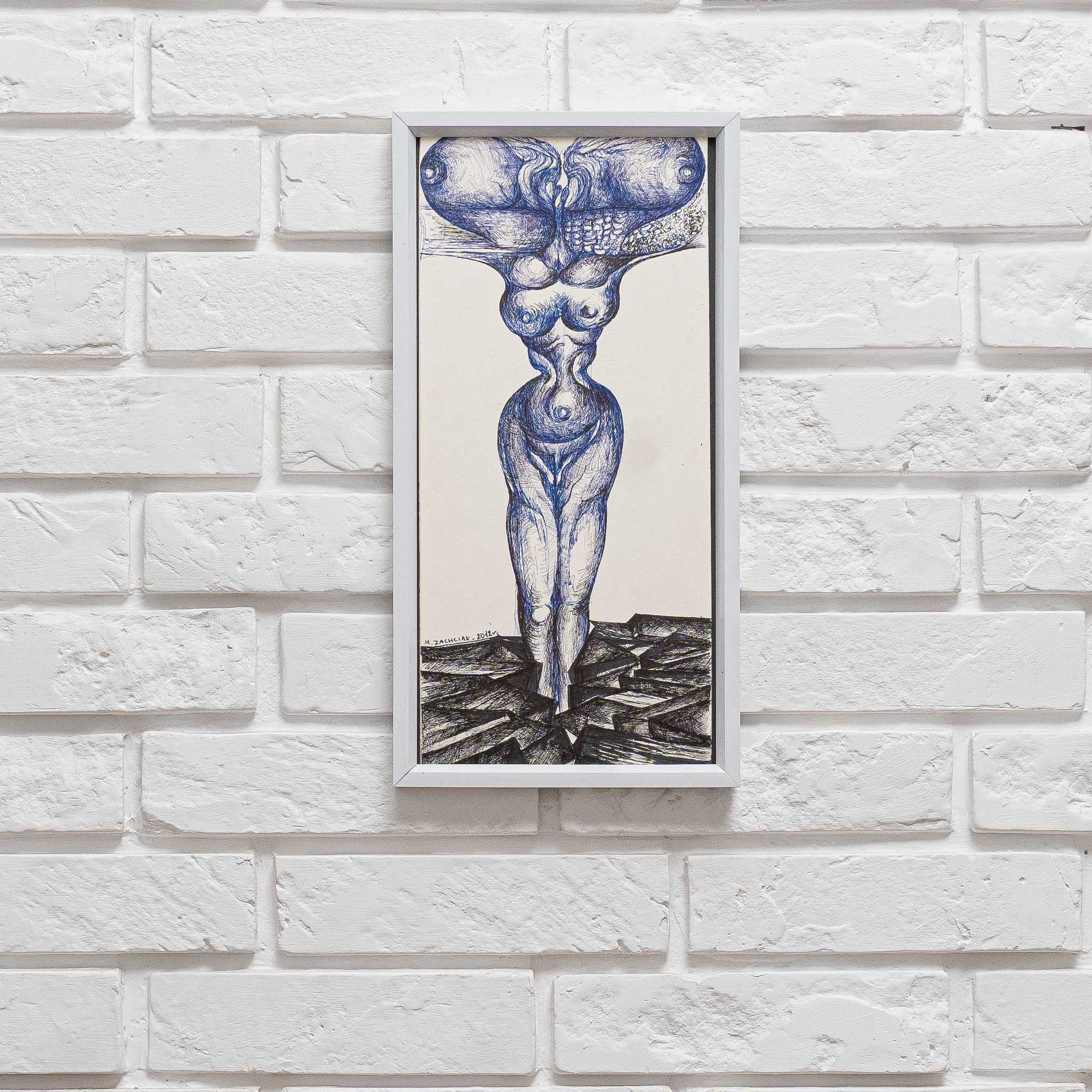 Centralnym elementem kompozycji jest abstrakcyjna postać kobiety, której ciało zdaje się być wyrzeźbione z niebieskiej materii, niemalże jak ze snów i wyobraźni. Jej sylwetka jest delikatna, a jednocześnie pełna siły, podkreślona przez dynamiczne linie i cieniowanie, które nadają jej trójwymiarowy charakter.