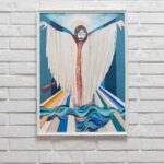 Tło obrazu, utrzymane w odcieniach błękitu i turkusu, przypomina niebo i wodę, symbolizujące nieskończoność i życie. Z dołu obrazu wyłaniają się wielobarwne pasma, które mogą symbolizować drogi prowadzące do nadziei i odkupienia. Te linie, w intensywnych odcieniach niebieskiego, pomarańczowego i białego, tworzą dynamiczny kontrast z spokojem centralnej postaci, przypominając, że pomoc i wsparcie mogą przyjść w najbardziej niespodziewanych momentach.