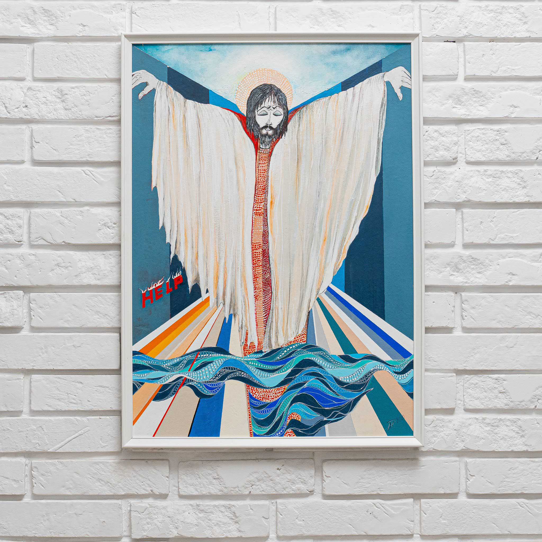 Po lewej stronie obrazu, na tle ciemniejszych odcieni, widnieje czerwony napis „HELP”. Jest to krzyk o pomoc, który wzmaga emocjonalny wymiar obrazu. Ten element przypomina, że choć możemy doświadczać trudności i czuć się zagubieni, zawsze istnieje nadzieja na wsparcie i wybawienie.