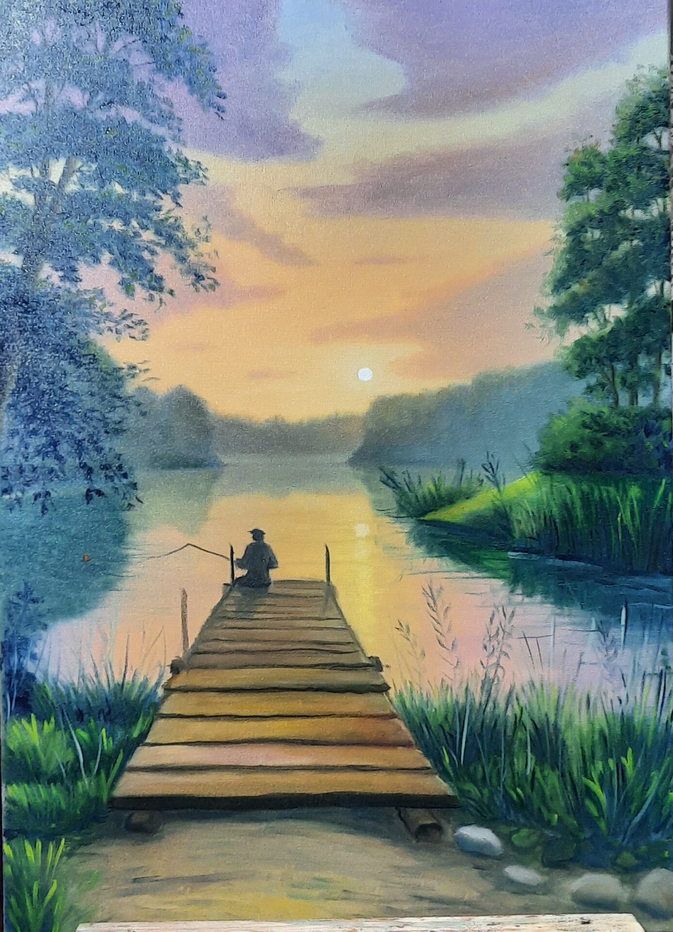 Obraz olejny na płótnie mojego autorstwa. Inspirowany wschodem słońca o poranku podczas pobytu na rybach. Wykonany 2024 roku.Format 70x50cm . Boki zamalowane. Sygnowany na awersie i rewersie.