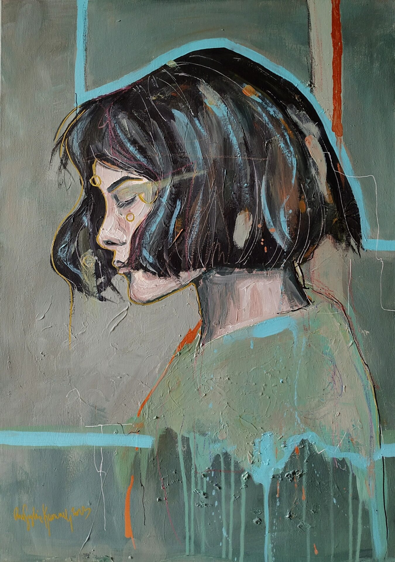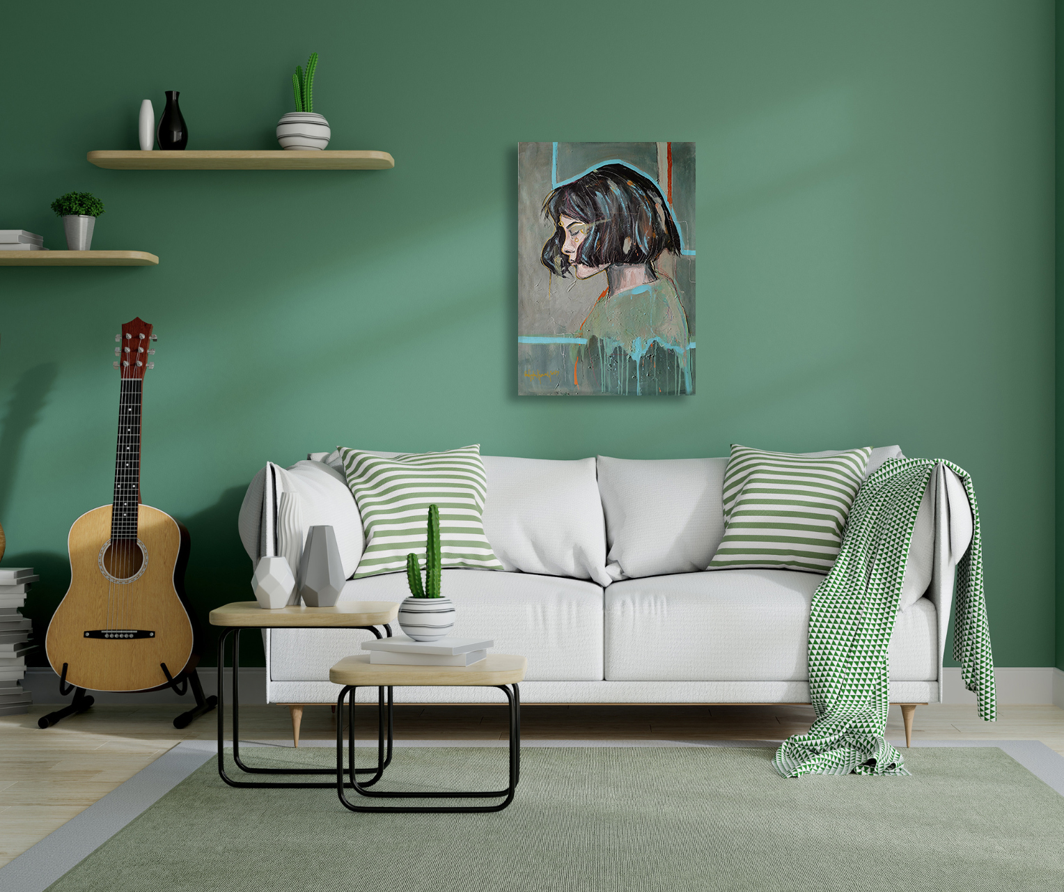 Akrylowy obraz na płótnie bawełnianym w stonowanych barwach.
