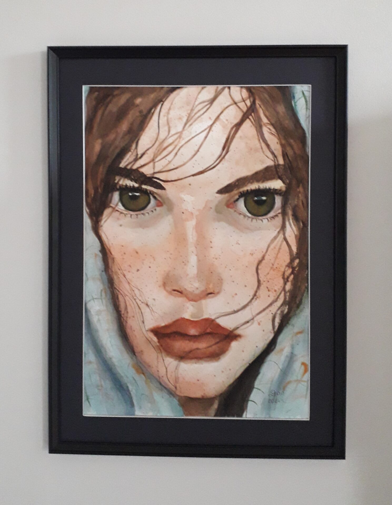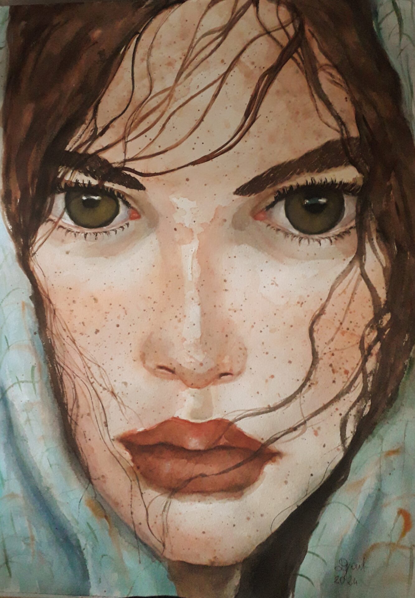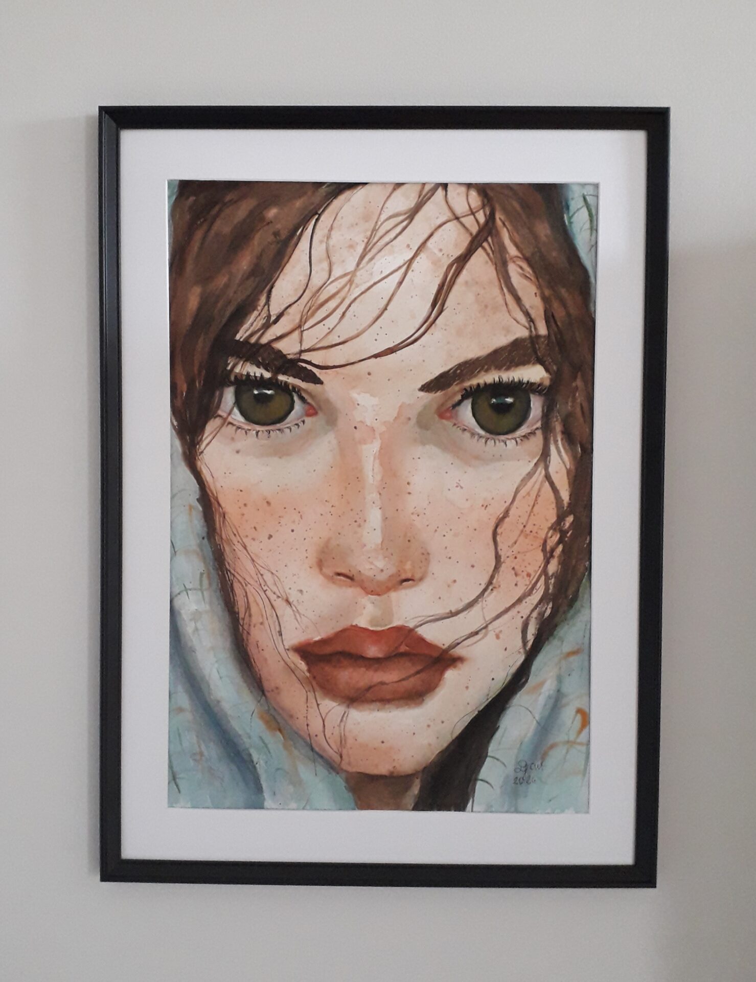 Portret dziewczyny. Akwarela na papierze 100% bawełny, gramatura 300 g. Obraz w formacie A2 (42×60 cm), Sprzedaję bez ramy i passpartout. Wysyłka kurierem (przedpłata) 20 zł. Zapraszam do zakupu.