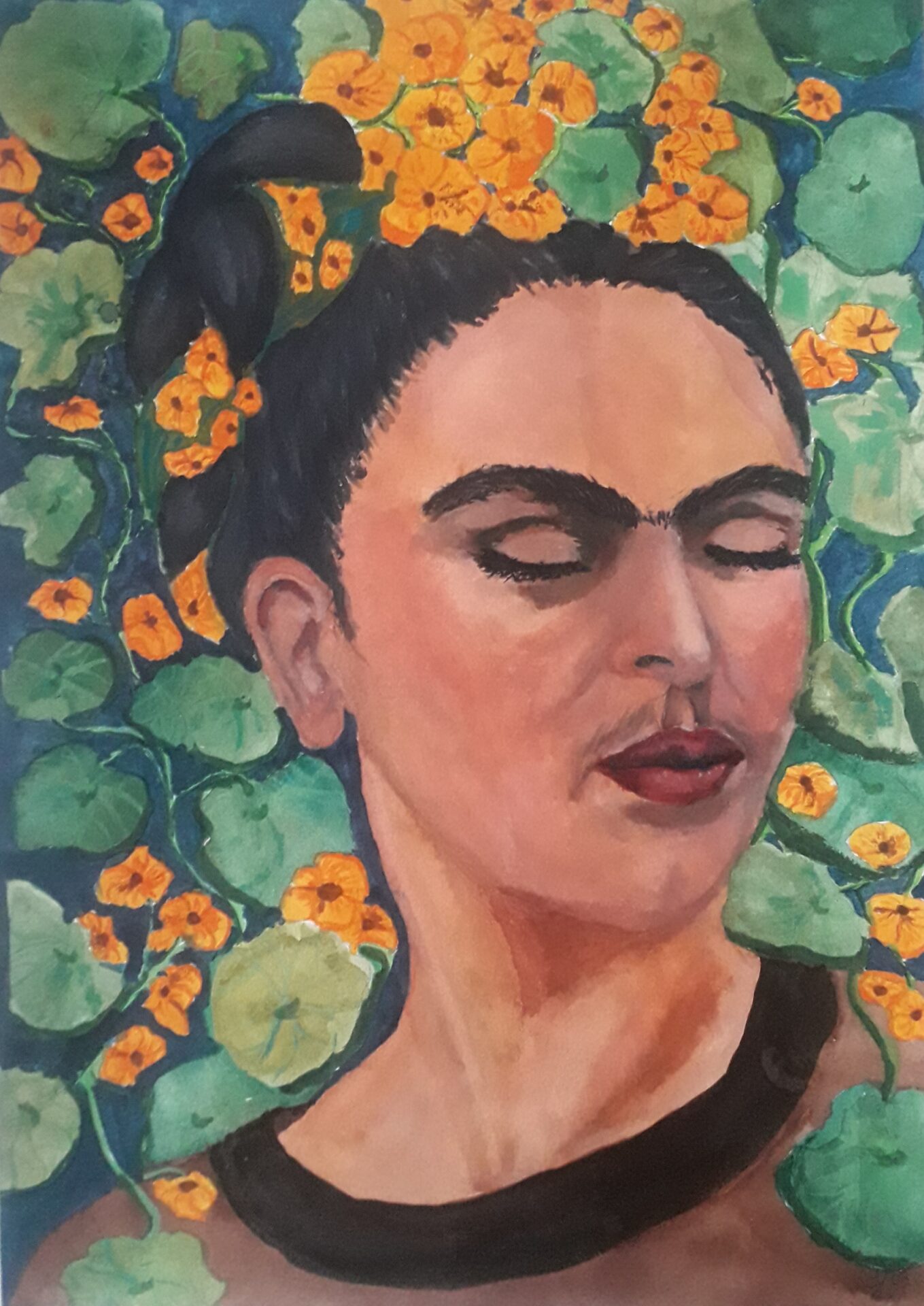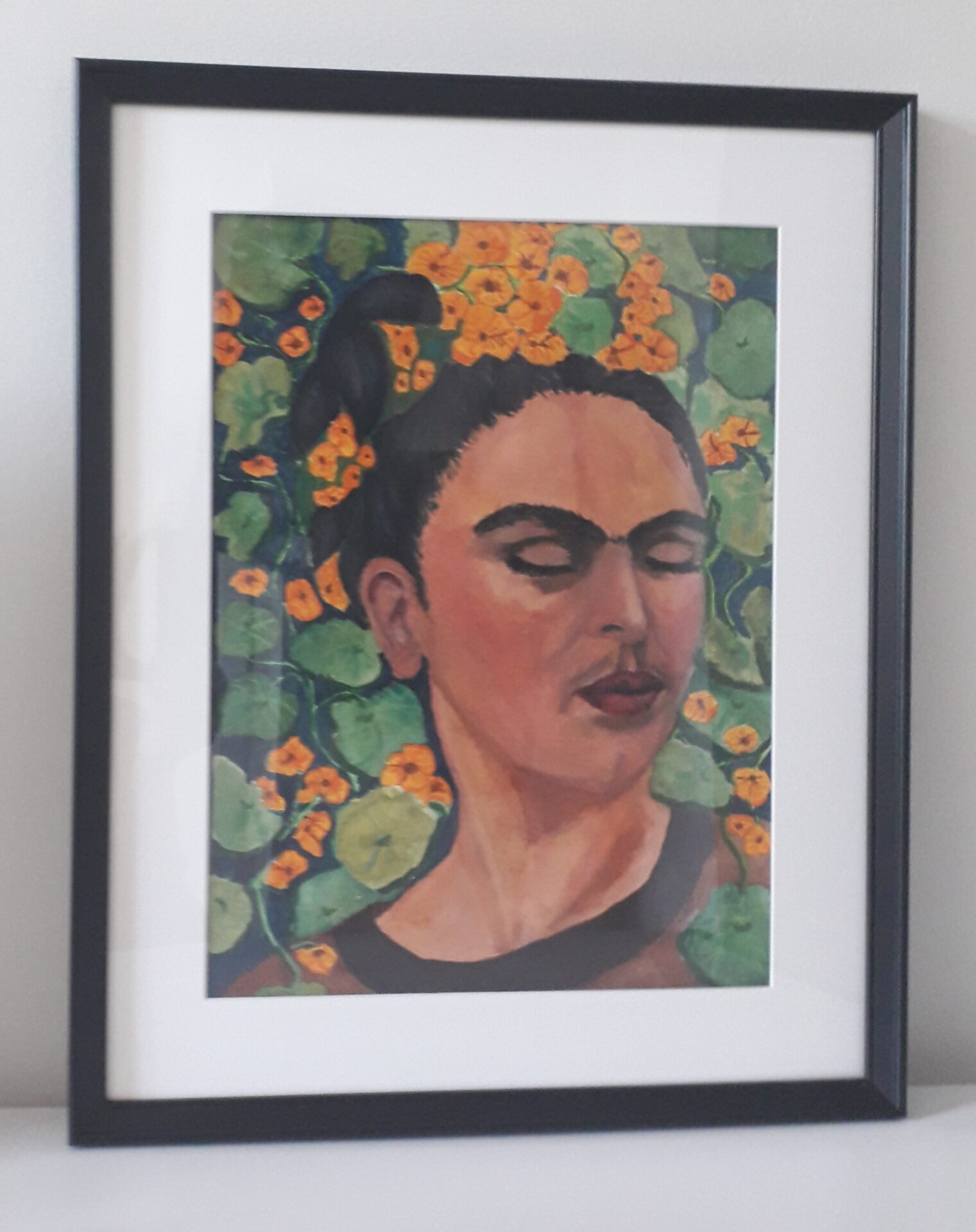 Portret Fridy Kahlo. Gwasz na papierze bawełnianym 300g/m2. Sygnowany, zabezpieczony werniksem. Wymiary obrazu 40 cm x 30 cm. Sprzedaję bez ramy i passpartout.