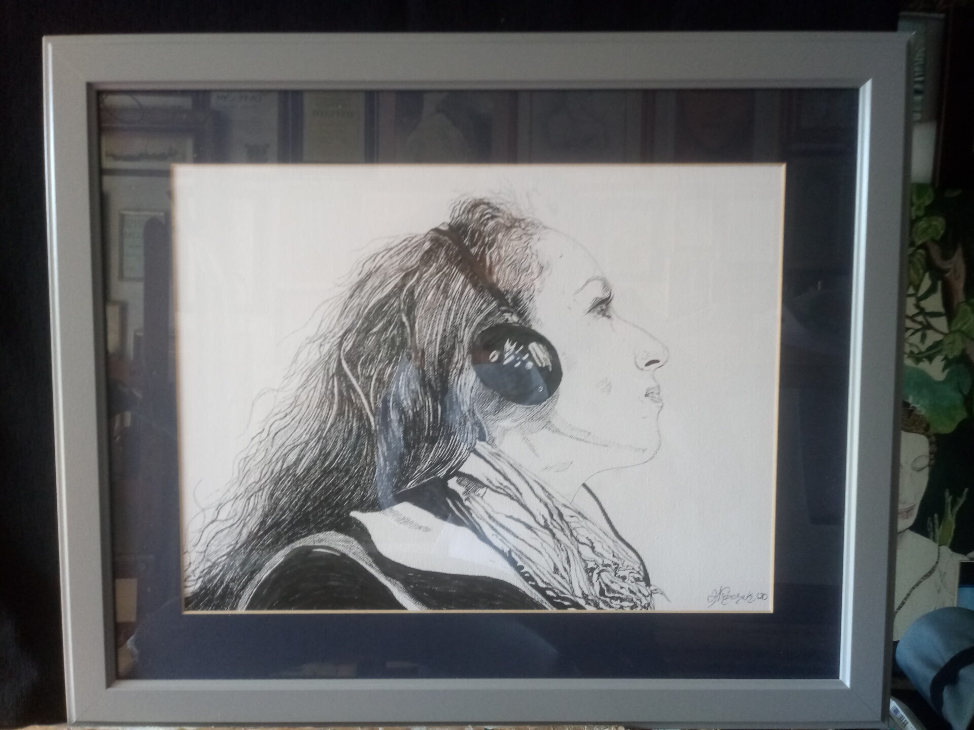 Rysunek tuszem olowek grafit.Plotno.Portret kobiecy.Barbara.60/50cm.Praca autorska.Oprawiony.Rama drewniana popielata ze szklem.Studium mofelki.
