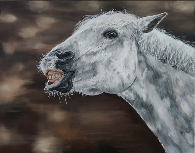 Namalowany farbami olejnymi. Stan idealny, zawerniksowany. Piękny siwy koń na portrecie
