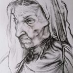 Na obrazie widzimy portret starszej kobiety, uchwyconej w sposób niezwykle realistyczny i przejmujący. Dominują tu odcienie szarości, głębia cieni i subtelne kontrasty. Artysta zastosował technikę rysunku ołówkiem, co podkreśla delikatność linii i fakturę skóry. Widać tu każdą zmarszczkę i fałdę, co dodaje portretowi autentyczności i życia. Kompozycja jest prosta, skoncentrowana na twarzy kobiety oraz jej chustce, co nadaje dziełu intymny charakter.