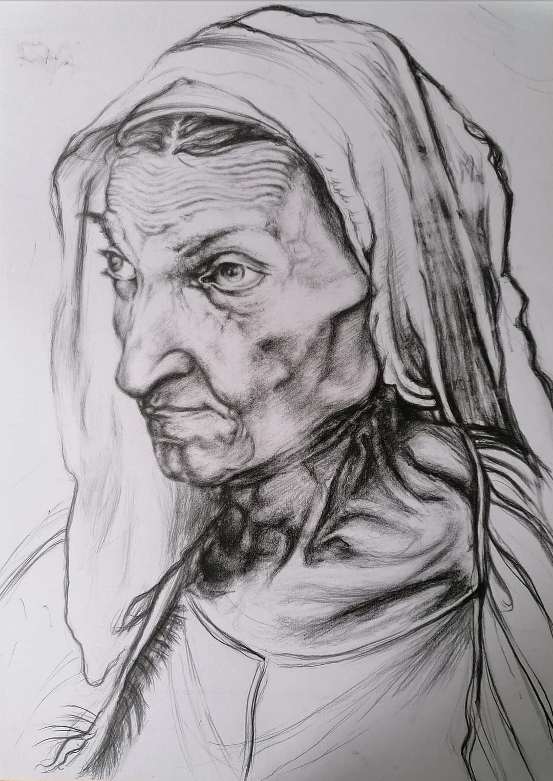 Na obrazie widzimy portret starszej kobiety, uchwyconej w sposób niezwykle realistyczny i przejmujący. Dominują tu odcienie szarości, głębia cieni i subtelne kontrasty. Artysta zastosował technikę rysunku ołówkiem, co podkreśla delikatność linii i fakturę skóry. Widać tu każdą zmarszczkę i fałdę, co dodaje portretowi autentyczności i życia. Kompozycja jest prosta, skoncentrowana na twarzy kobiety oraz jej chustce, co nadaje dziełu intymny charakter.