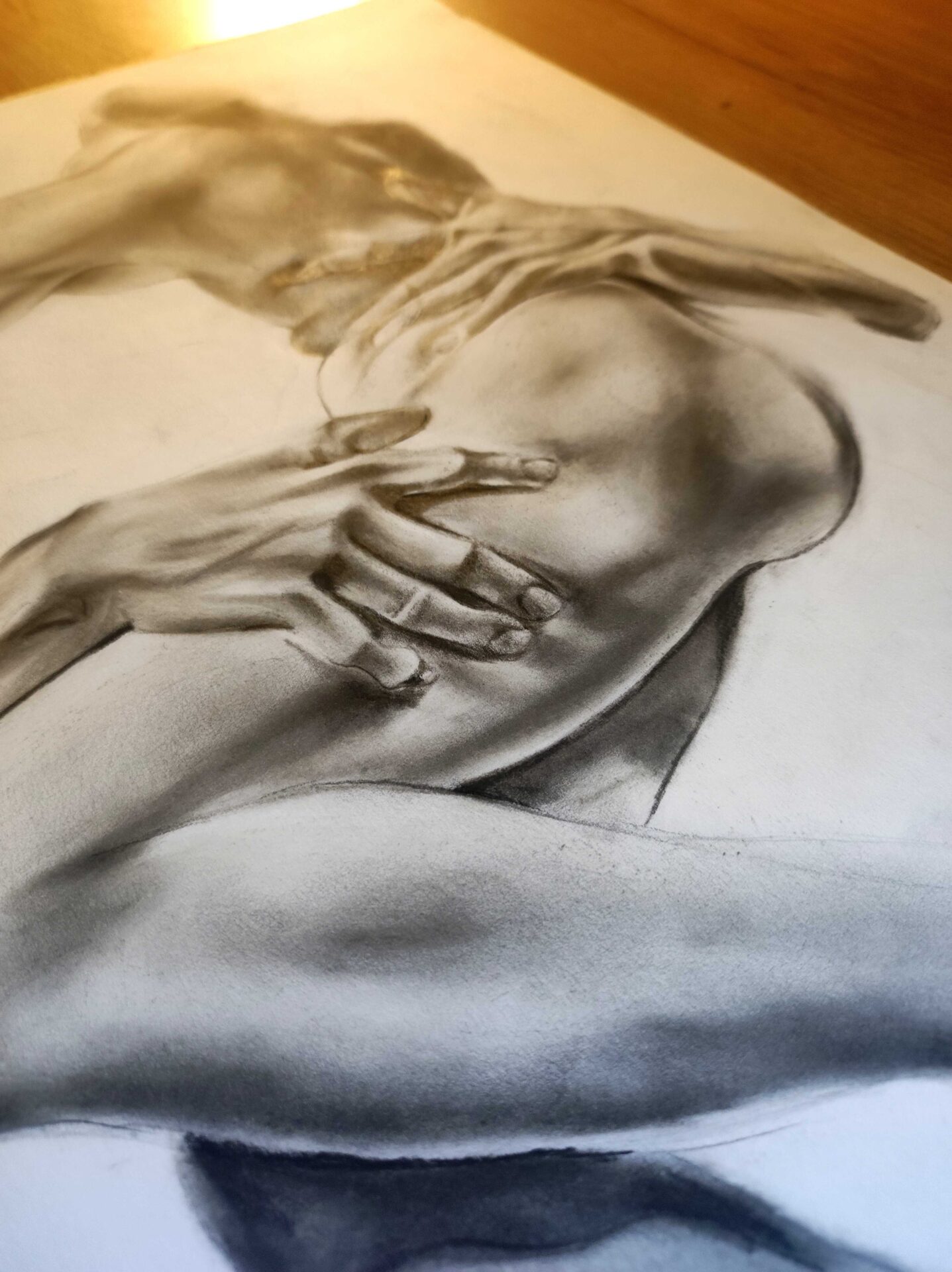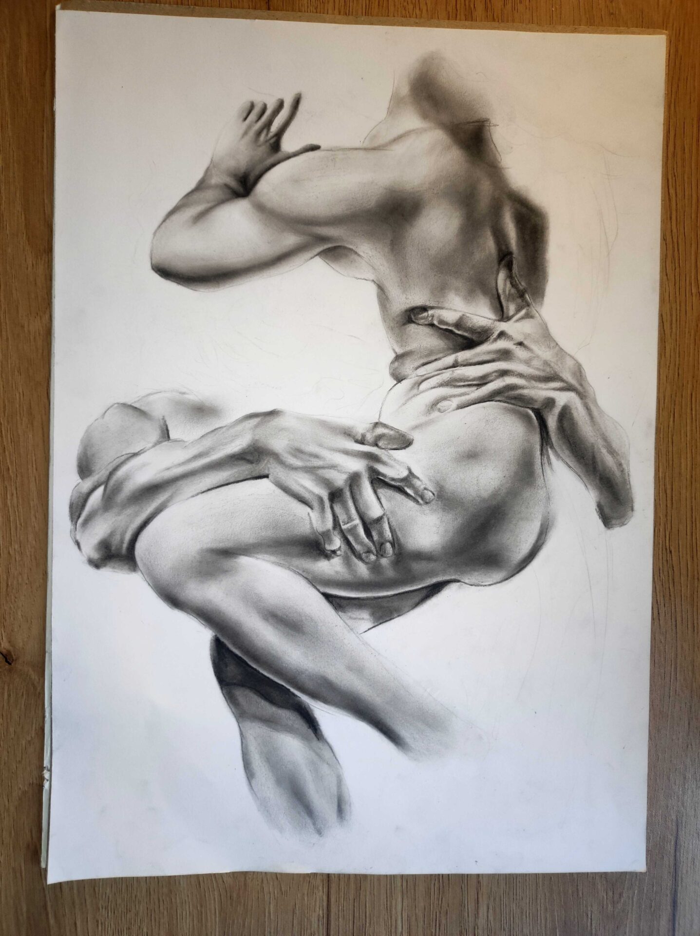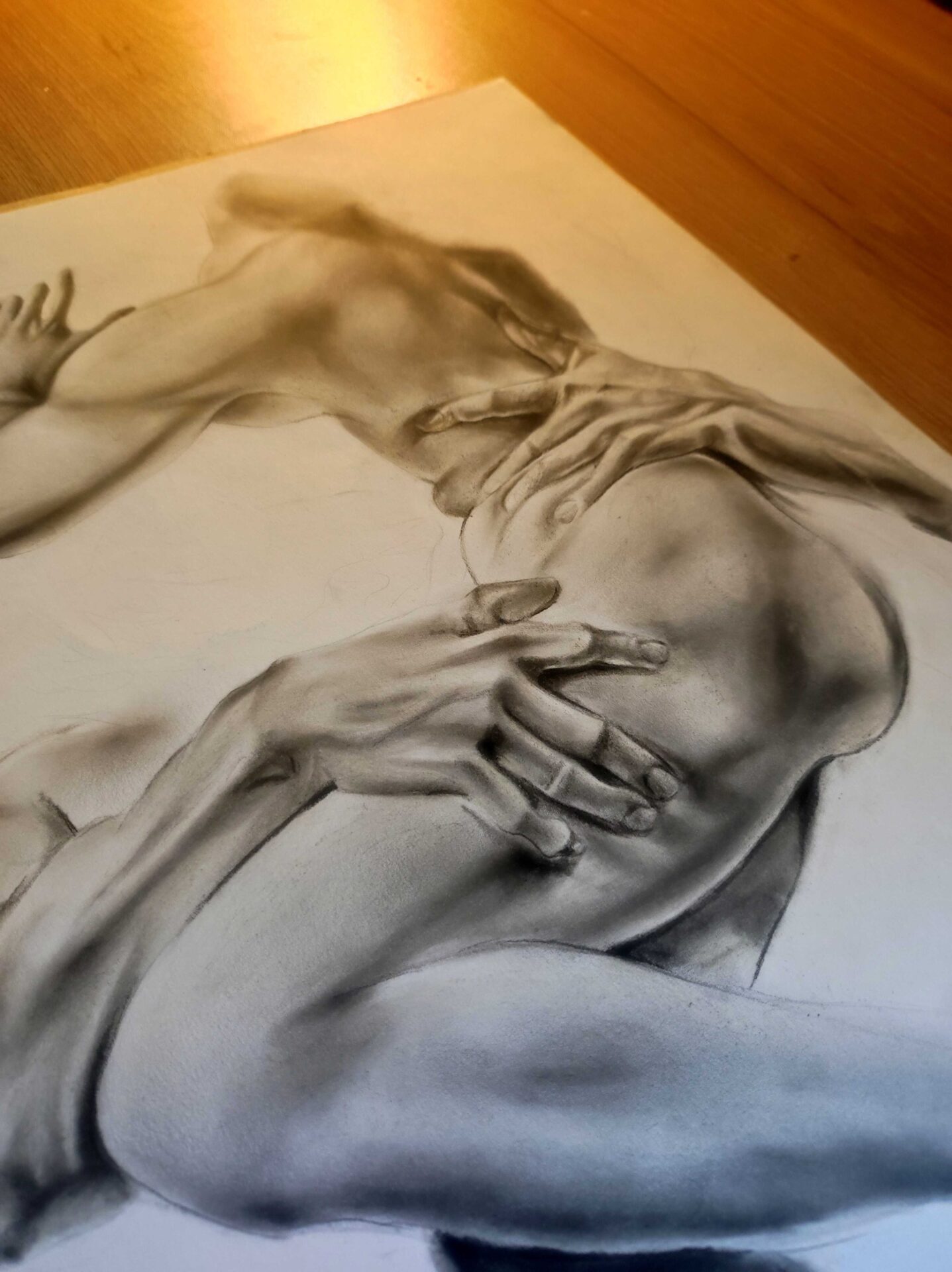 Rysunek wykonałam węglem oraz kredą, na formacie a3. Jest inspirowany rzeźba pt. „Porwanie Prozerpiny”. Dzieło tworzone kilka dni, wieloma godzinami. Zainspirowały mnie w szczególności wszystkie wgłębienia w ciele i skórze, wykonane przez palce, elementy ukazujące krągłość ciała i cienie oddające wyrazistość. A wszystko to sądzę, że wiernie oddane jest w pracy i obrazuje sama esencję tego widoku.