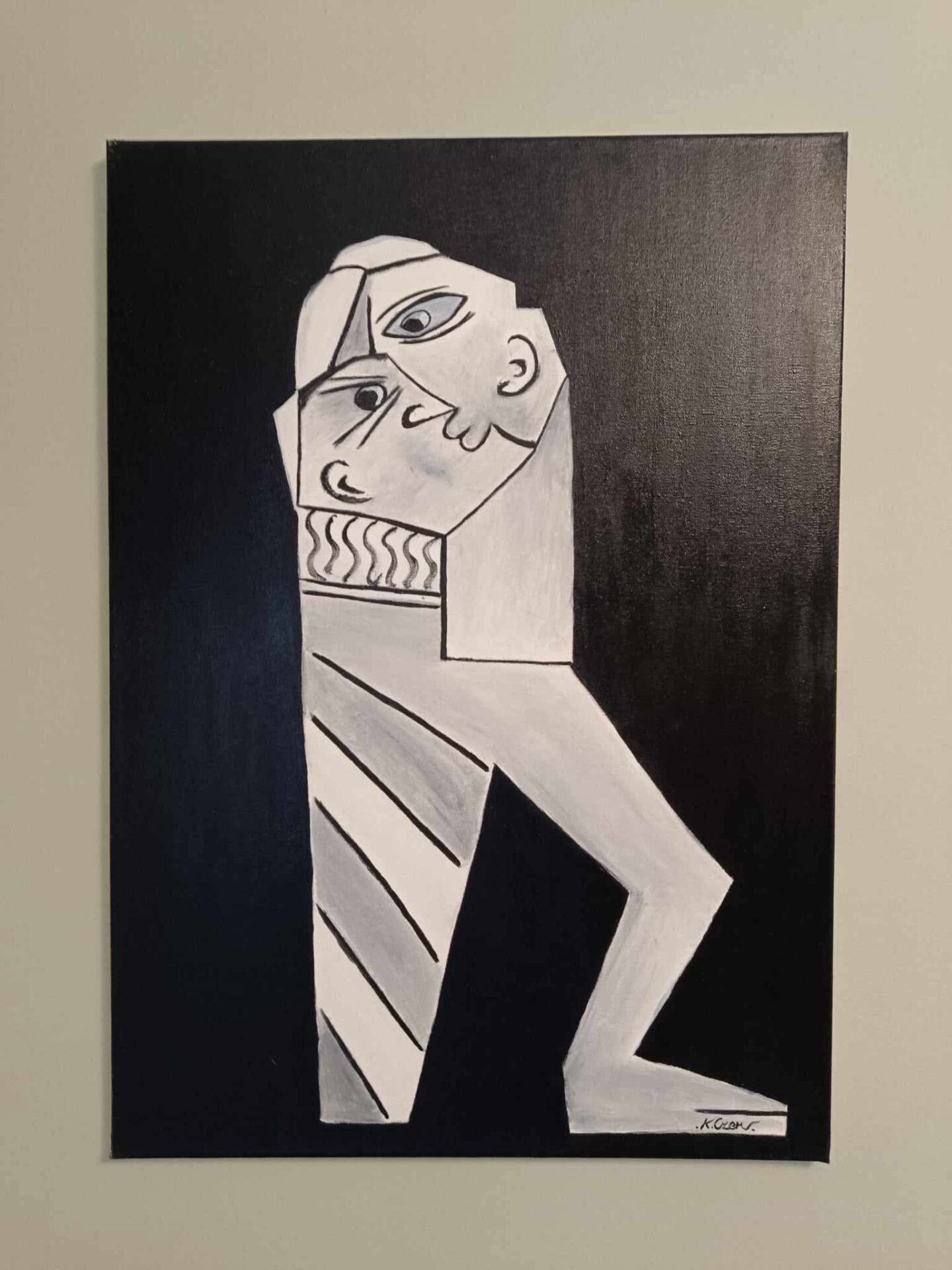 Minimalistyczny obraz utrzymany w monochromatycznej palecie barw przedstawia kubistyczną postać na tle intensywnej czerni. Geometryczne kształty i przerysowane proporcje budują surrealistyczną sylwetkę, której twarz zdaje się składać z kilku perspektyw jednocześnie. Linie i pasy na ciele wprowadzają dynamiczny rytm do kompozycji, podkreślając kontrast pomiędzy światłem a cieniem. Obraz emanuje tajemniczością i zachęca widza do interpretacji zarówno emocji postaci, jak i symboliki ukrytej w uproszczonej formie.