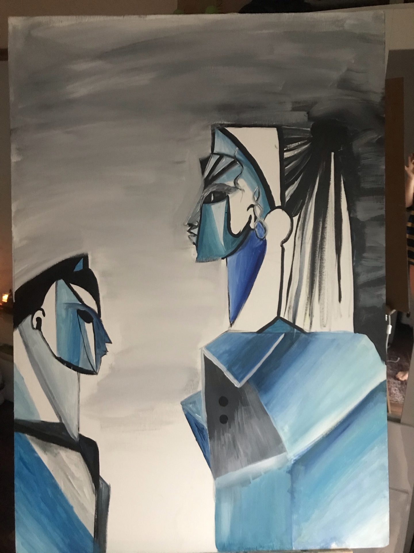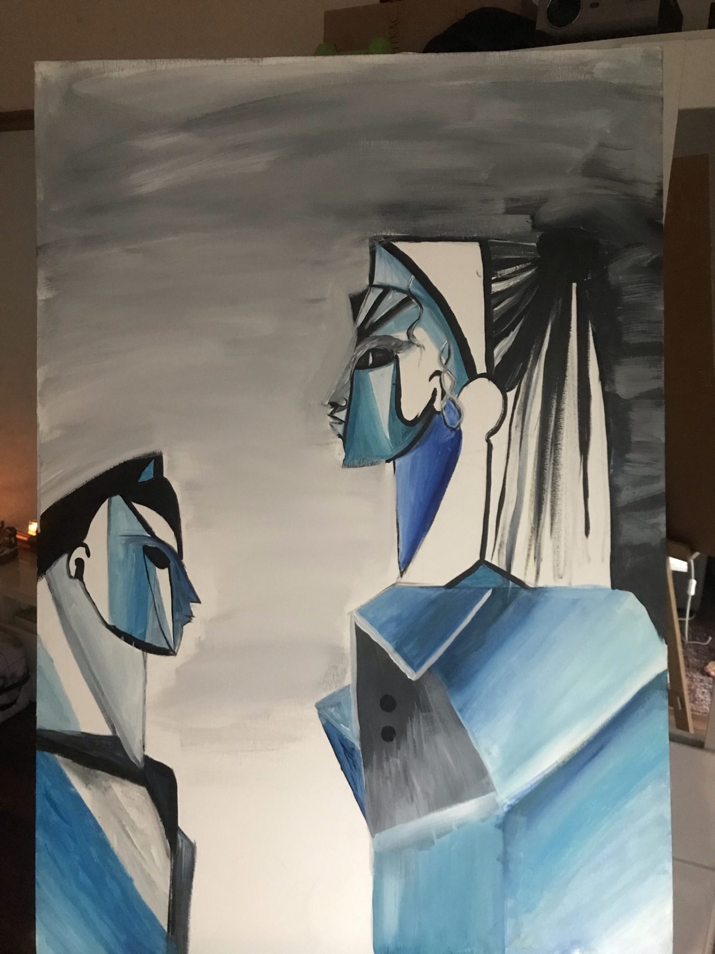 Obraz przedstawia dwie postacie, kolory turkus niebieski szary, płótno