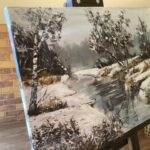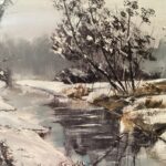 Praca powstała na przełomie 2022 i 2023 r. Inspiracją był spacer w zimowy,mroźny nad brzegami potoku Skoryni-w okolicy, gdzie mieszkam. Takie wędrówki są moją codziennością, każdy kto posiada spragnionego spacerów psa ,wie jak to jest 😉. Moje spacery są też wspaniałą okazją do poszukiwania inspiracji-tak jak stało się w tym przypadku.