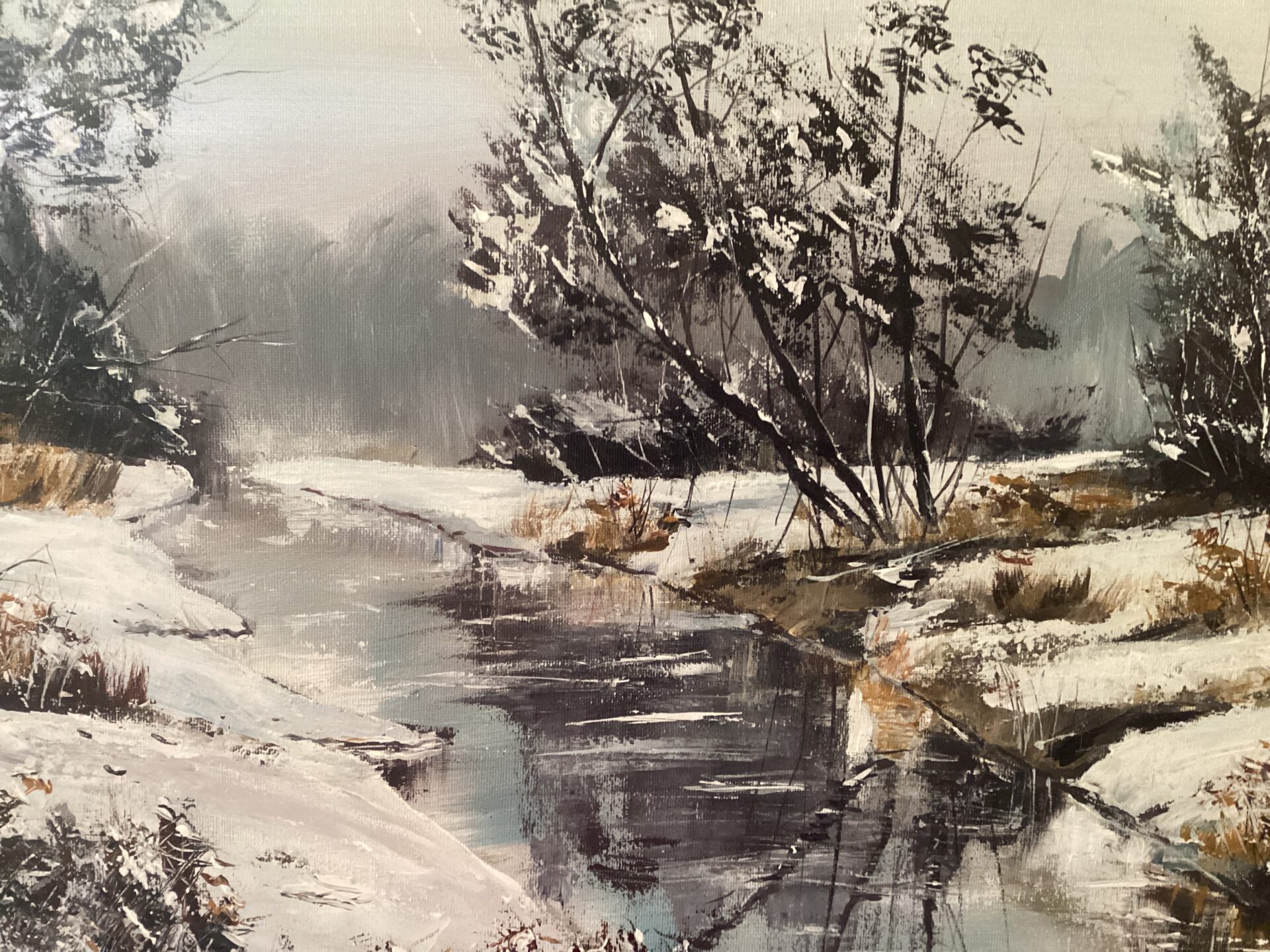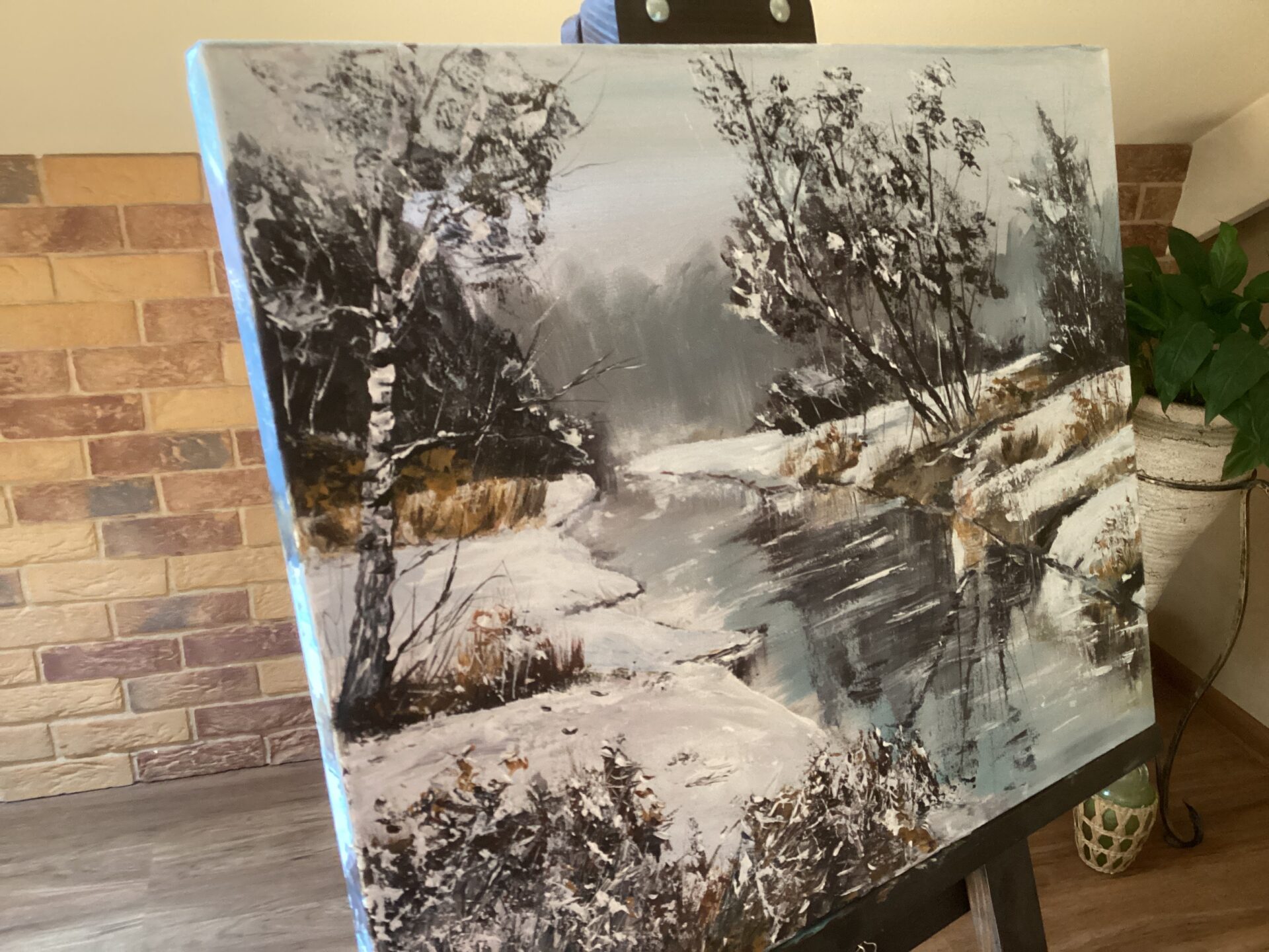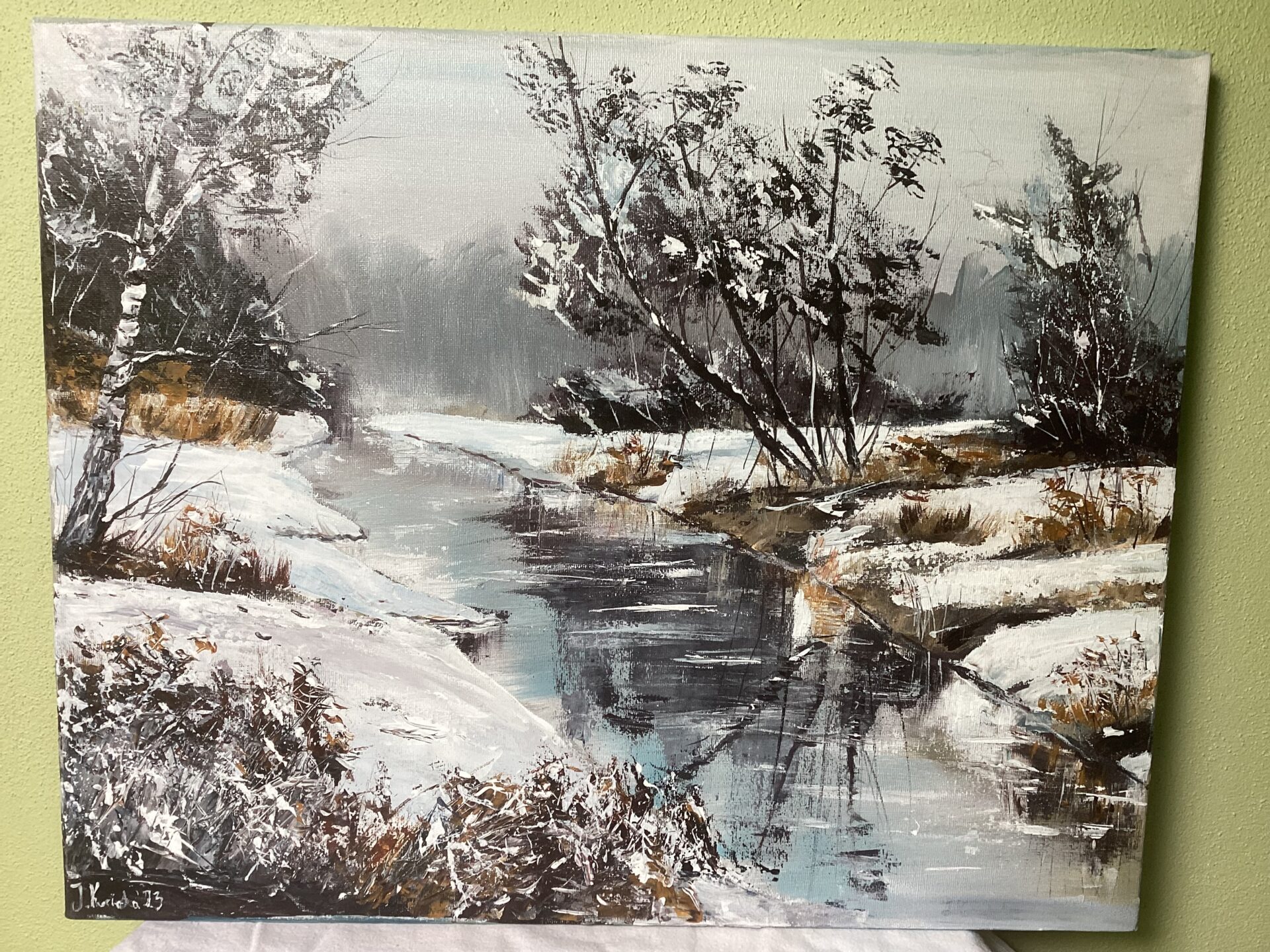 Praca powstała na przełomie 2022 i 2023 r. Inspiracją był spacer w zimowy,mroźny nad brzegami potoku Skoryni-w okolicy, gdzie mieszkam. Takie wędrówki są moją codziennością, każdy kto posiada spragnionego spacerów psa ,wie jak to jest 😉. Moje spacery są też wspaniałą okazją do poszukiwania inspiracji-tak jak stało się w tym przypadku.