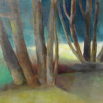 Obraz przedstawia pnie drzew oraz padające na nie z daleka słońce. Został namalowany w plenerze. Rozmiar obrazu 80×60
