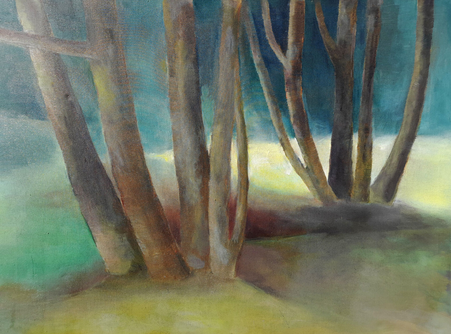 Obraz przedstawia pnie drzew oraz padające na nie z daleka słońce. Został namalowany w plenerze. Rozmiar obrazu 80×60