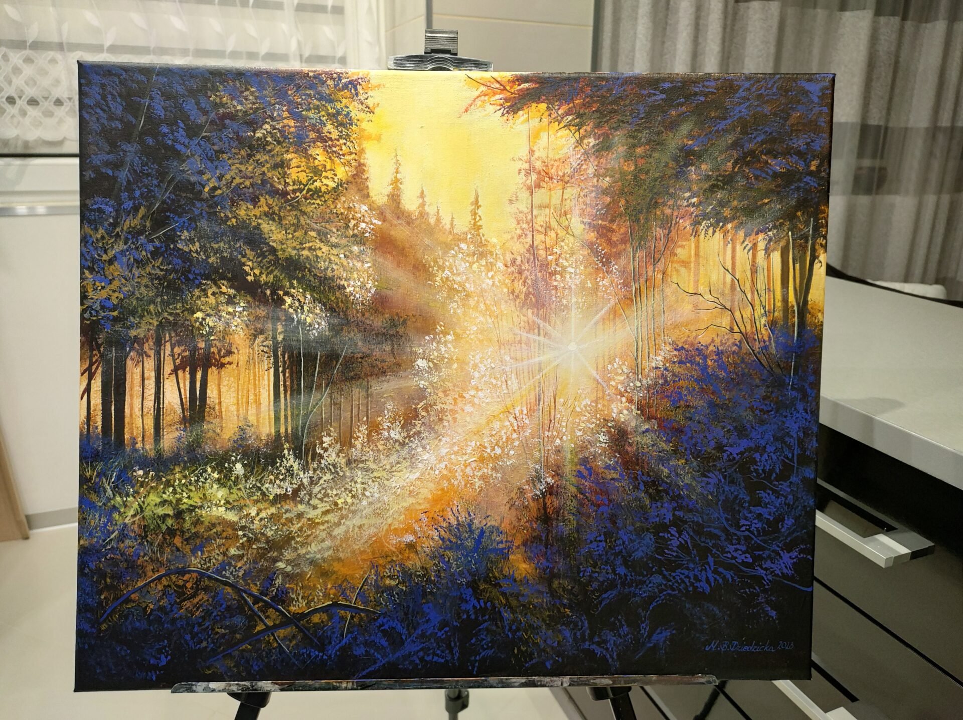 Obraz mojego autorstwa, namalowany profesjonalnymi farbami akrylowymi na podobraziu malarskim pokrytym bawełnianym płótnem (płótno naciągnięte na drewnianą blejtramę). Pracę wykonano przy pomocy pędzla i szpachli. Wykończono werniksem z połyskiem. Wymiary: około 49,5 x 59,5 cm. Boki obrazu zostały zamalowane zgodnie z kolorystyką całości. Podpis autora znajduje się na awersie i rewersie.