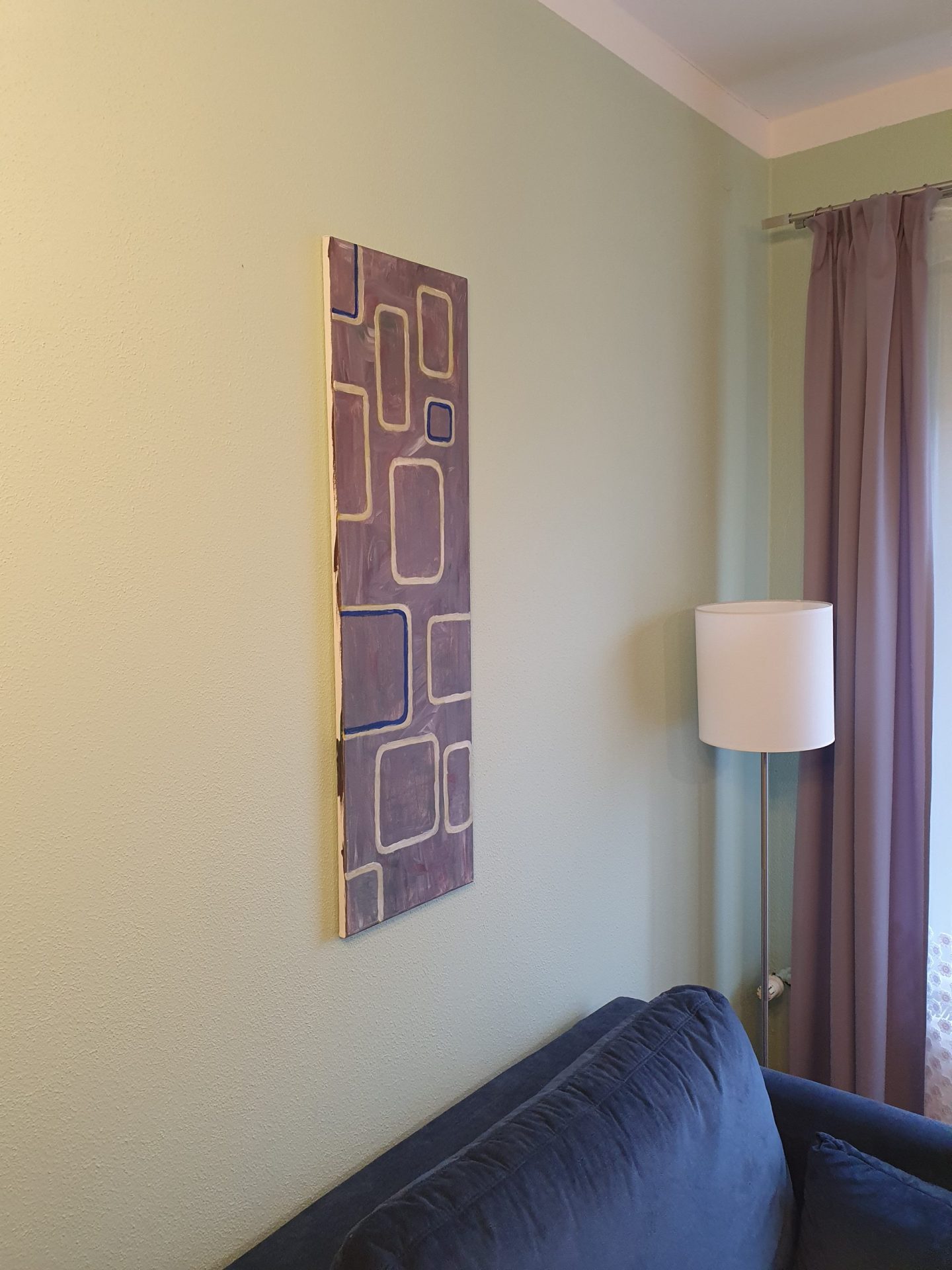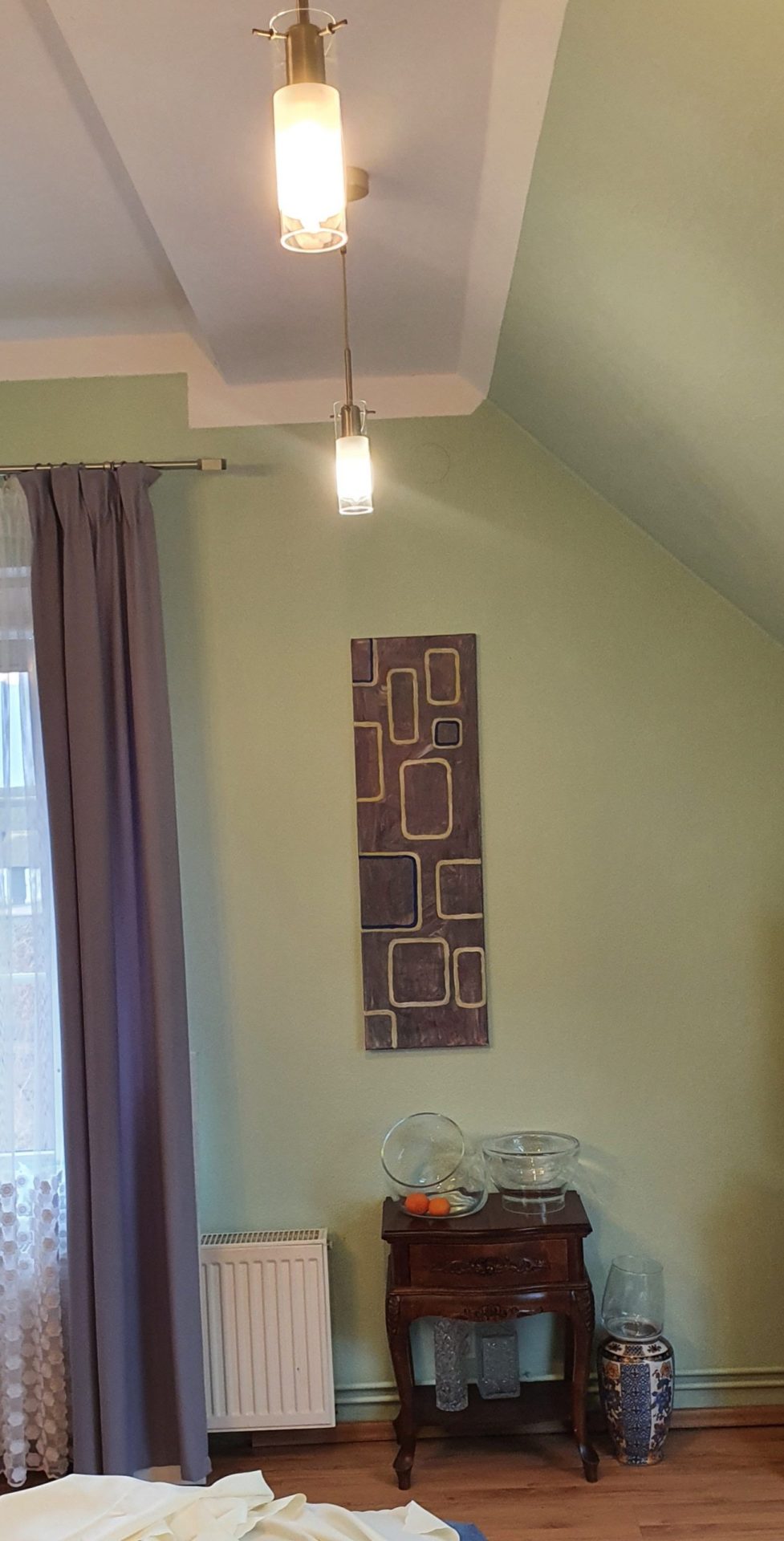 Akryl na płótnie, na żywo idealnie pasuje do lekko zielonych ścian i szarych zasłon