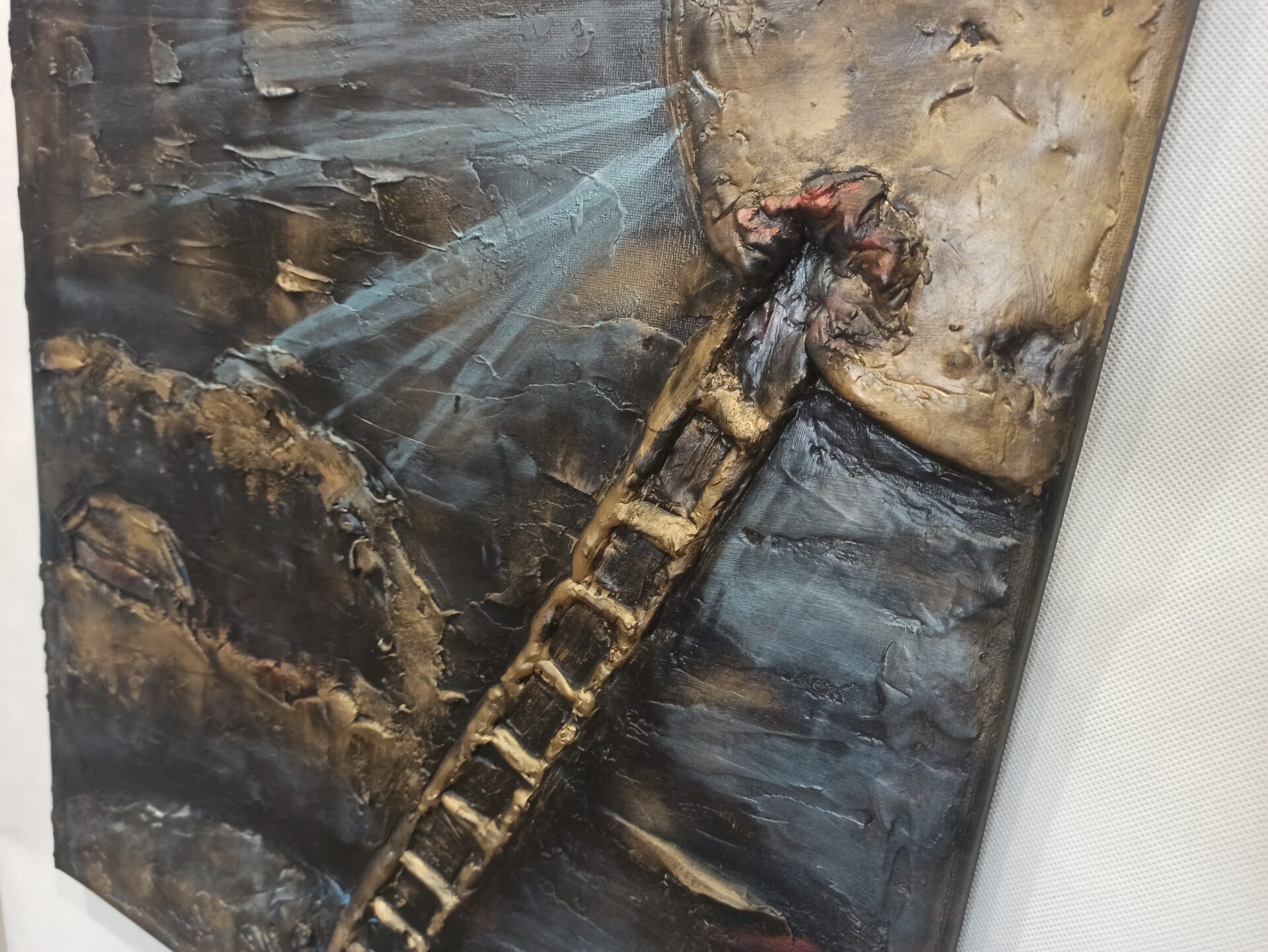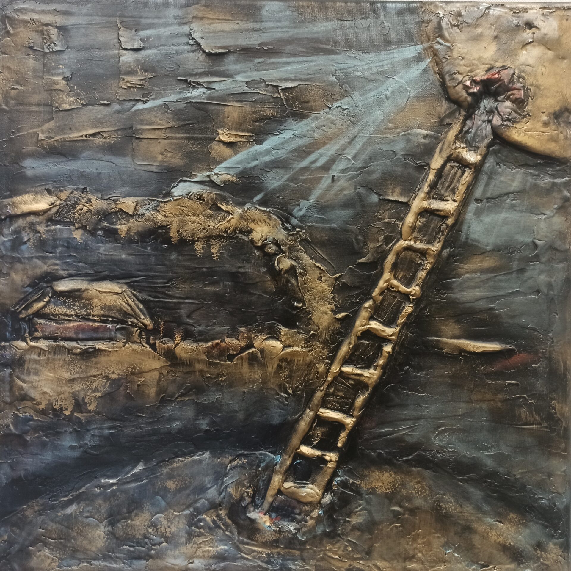 Obraz strukturalny na podobraziu malarskim,namalowany farbami akrylowymi ,zabezpieczony podwójną warstwą lakieru.Wymiary 50/50, technika własna,boki obrazu zamalowane.