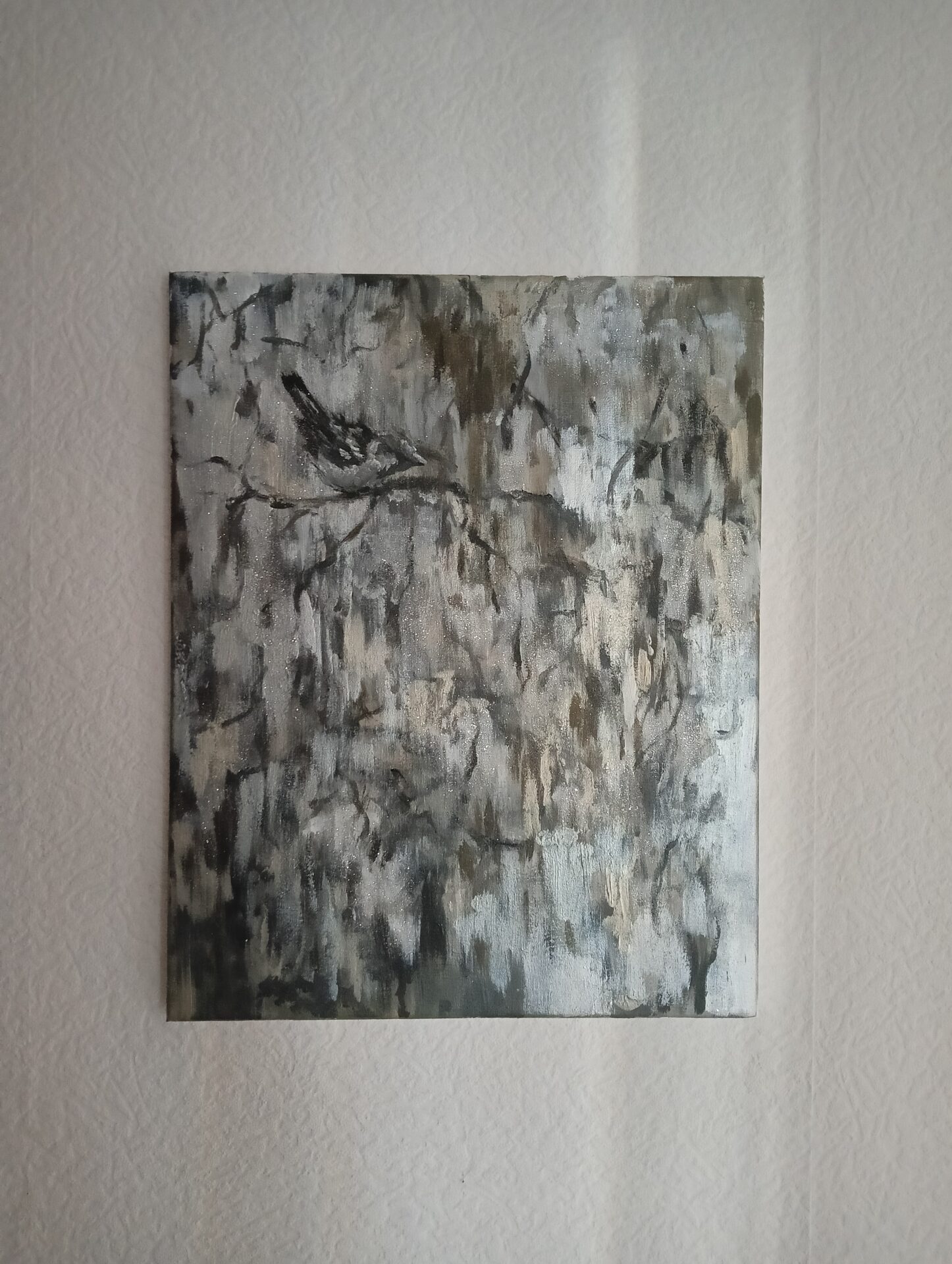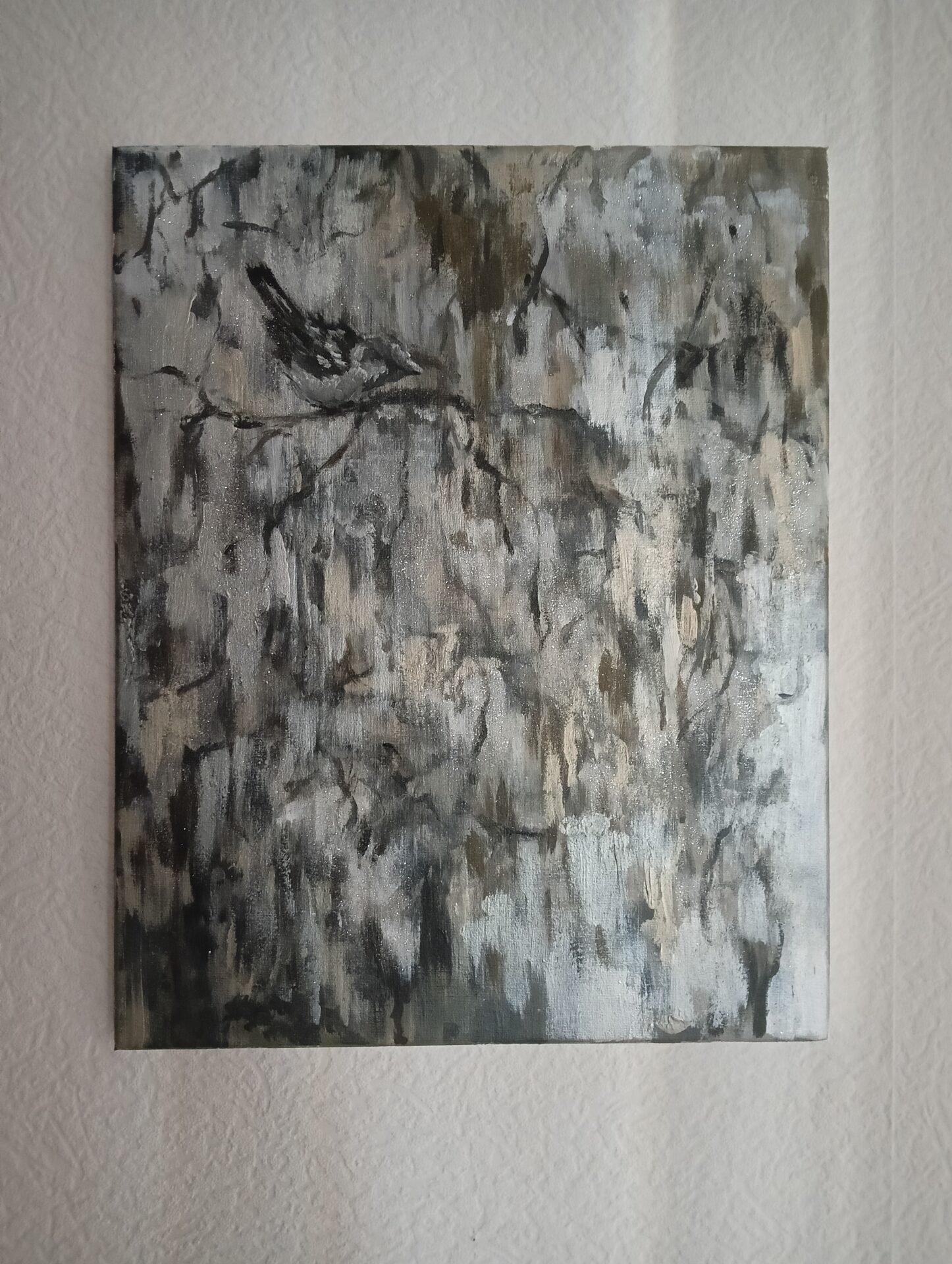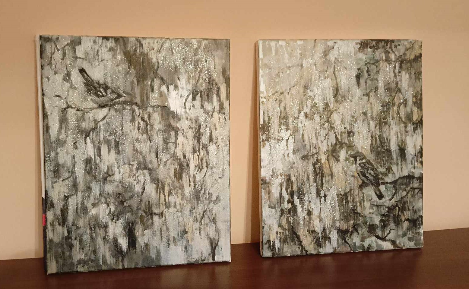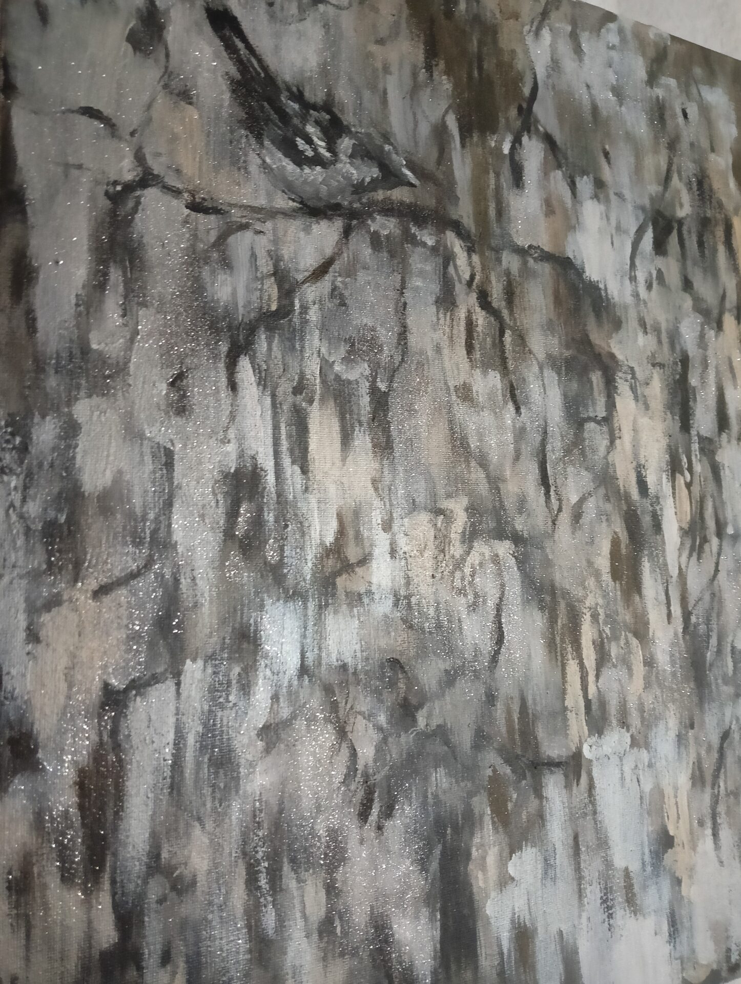 Akryl na płótnie, obraz abstrakcyjny, inspirowany naturą. Utrzymany w kolorach szarości, beżu posiada także mieniące się drobiny wchodzące w interakcję ze światłem zarówno naturalnym jak i sztucznym. Chętnie udostępnię filmiki z zachowaniem światła i odbić na obrazie. Dostępne są dwa obrazy w tej tematyce, tworzące spójną kompozycję.