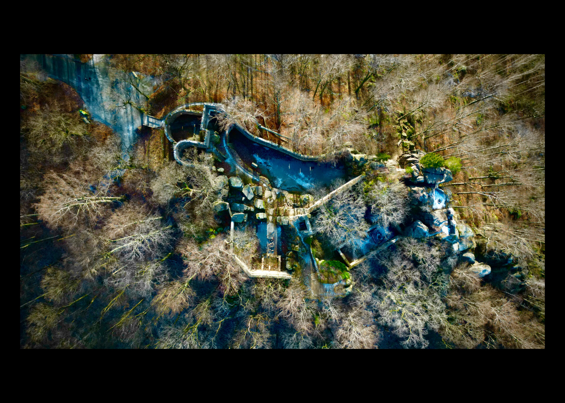 Ruiny zamku Bolczów widziane z lotu ptaka, same wyglądają jak ptak.