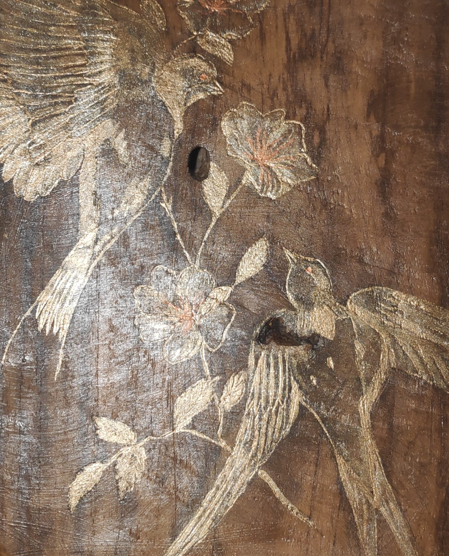 Ptaki grawerowane i malowane na drewnie tekowym, zabezpieczone werniksem, drewno naturalne
