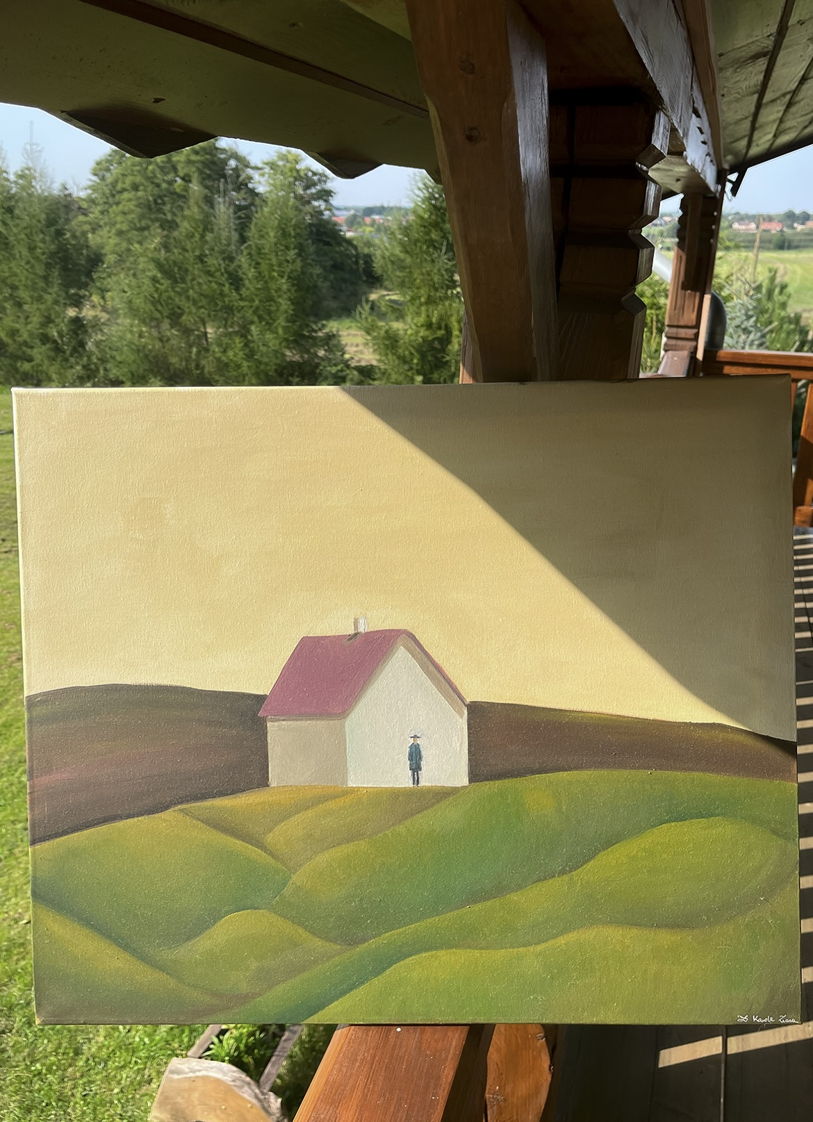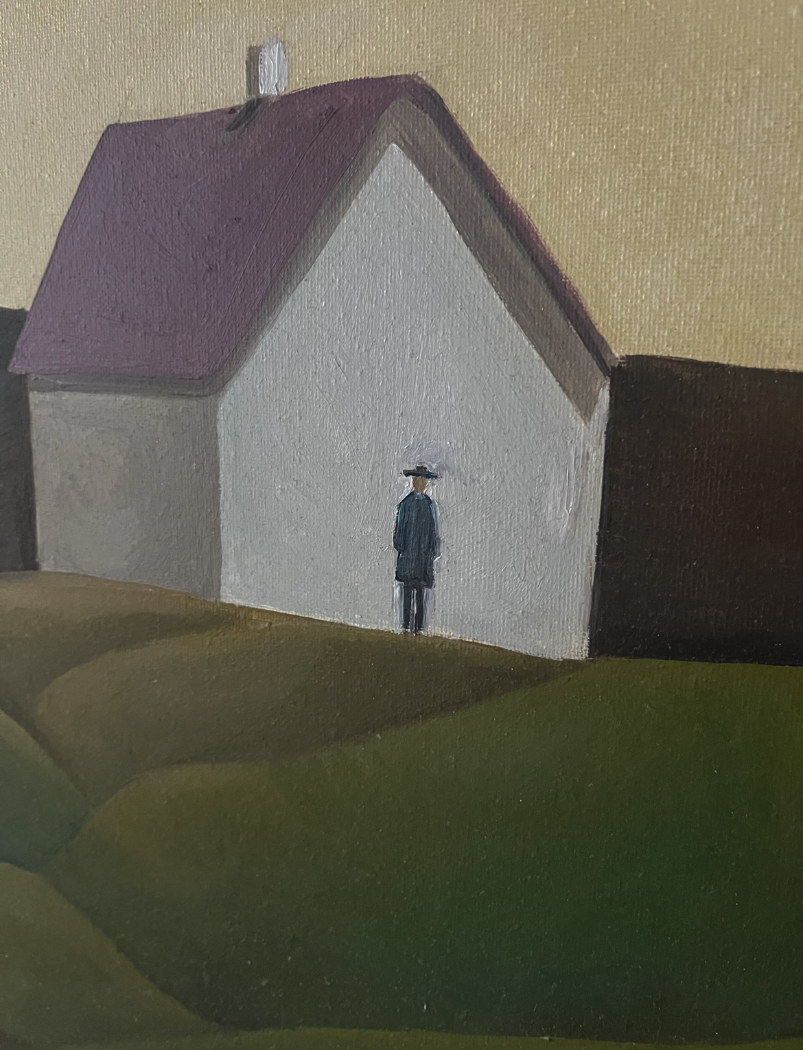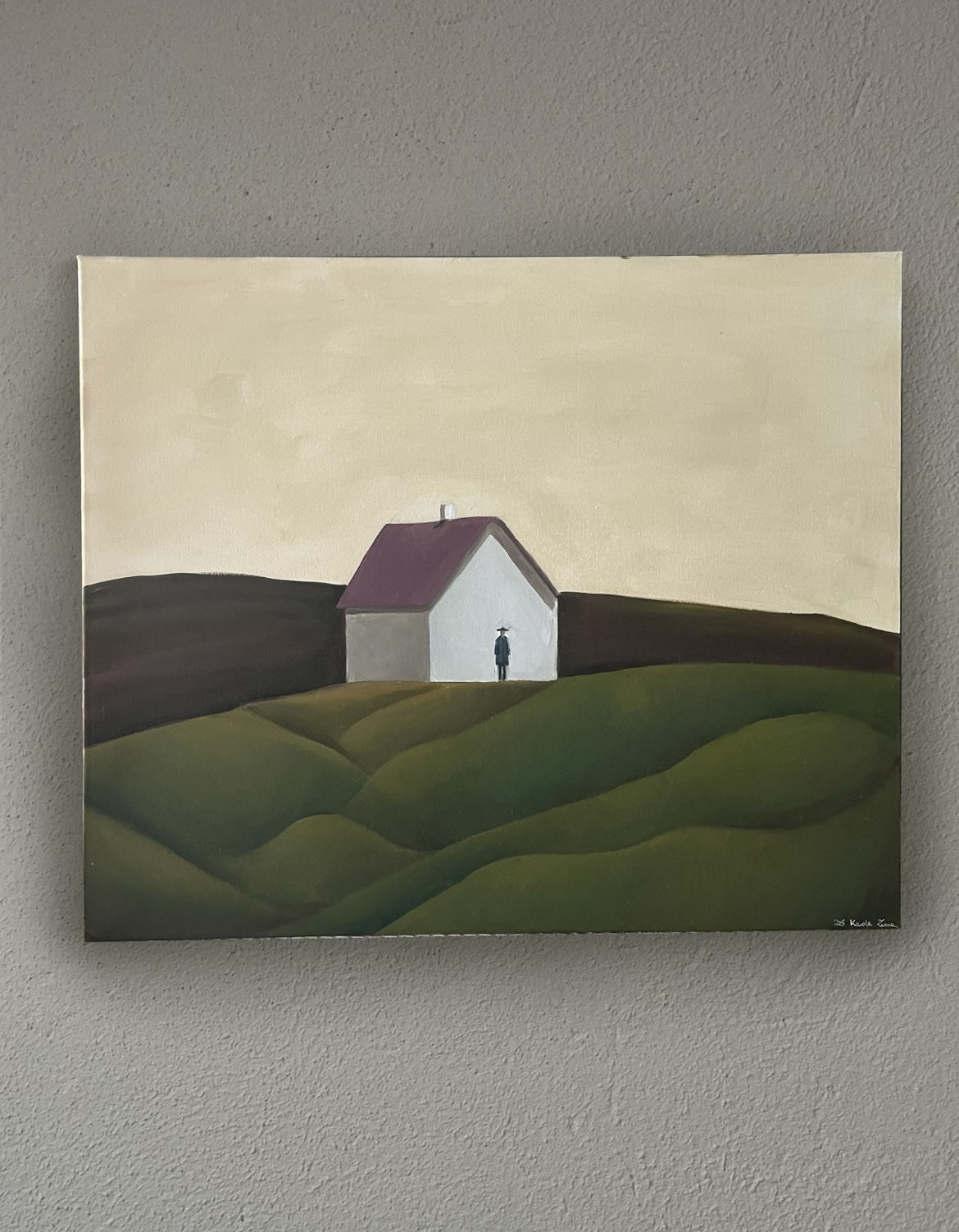 - Jest to obraz olejny, który powstał z myślą o przestrzeni i minimalizmie. Postać człowieka w obliczu pustej rzeczywistości. Stateczność symbolizuje spokój, który może być zastanawiający w konfrontacji z domem do którego nie da się wejść i rzeczywistością bez konkretnego wyrazu.