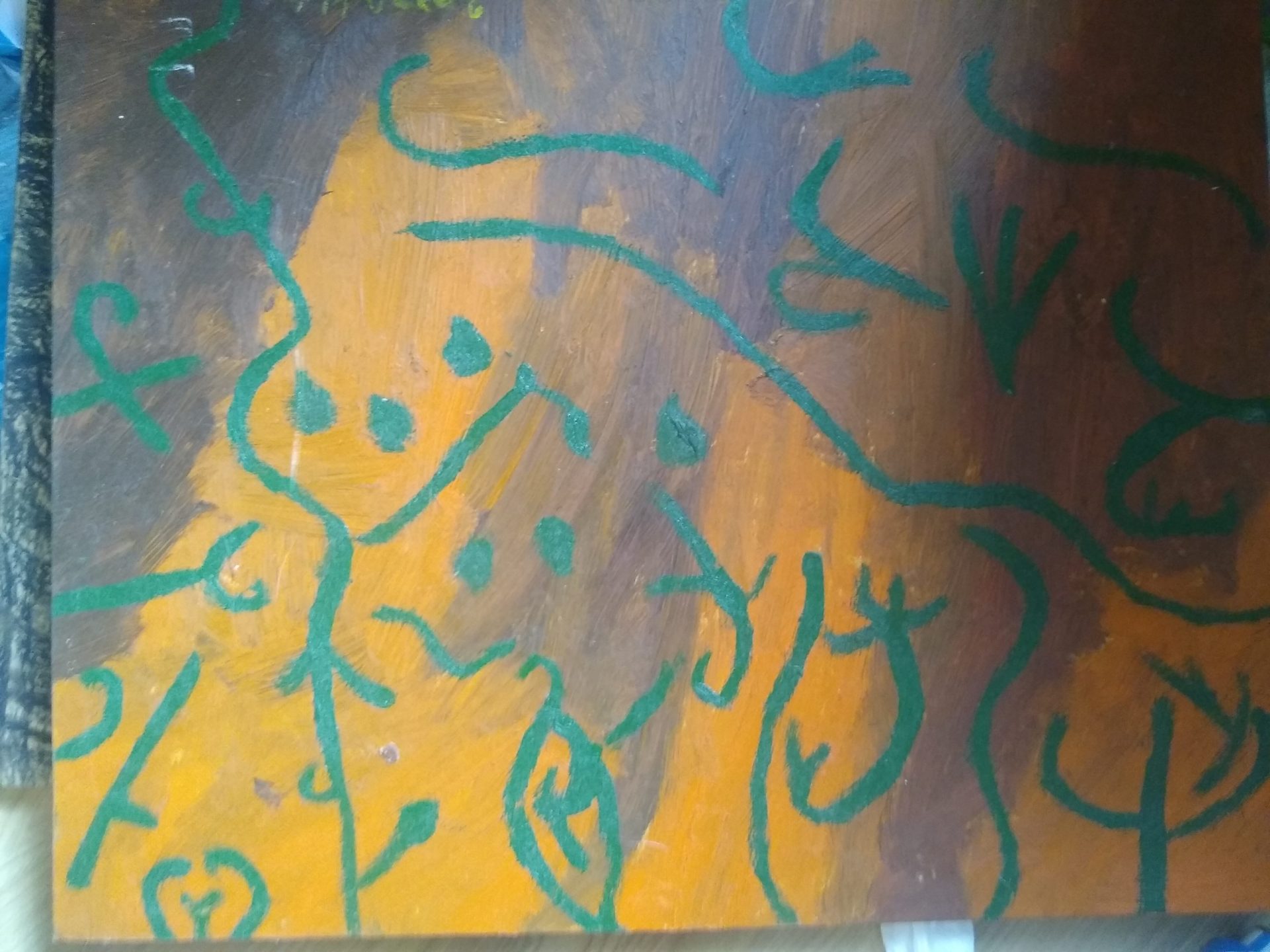 Jest to przepiękny abstrakcyjny obraz. Namalowany farbami olejnymi . Gdy go malowałam miałam 15 lat . Przedstawia on pustynię pełną zielonych abstrakcyjnych korzonek ludzkich . Symbolika kolorów oraz abstrakcyjnych kontynentów w których zieleń przemierza świat. Pełen ludzi o utraconej nadziei i pustynnej samotności , a także sięgających wewnątrz siebie. Pustynia to kontemplacja i samorealizacja, medytacja. To pełen ukrytych motywów obraz takie jest jego piękno.