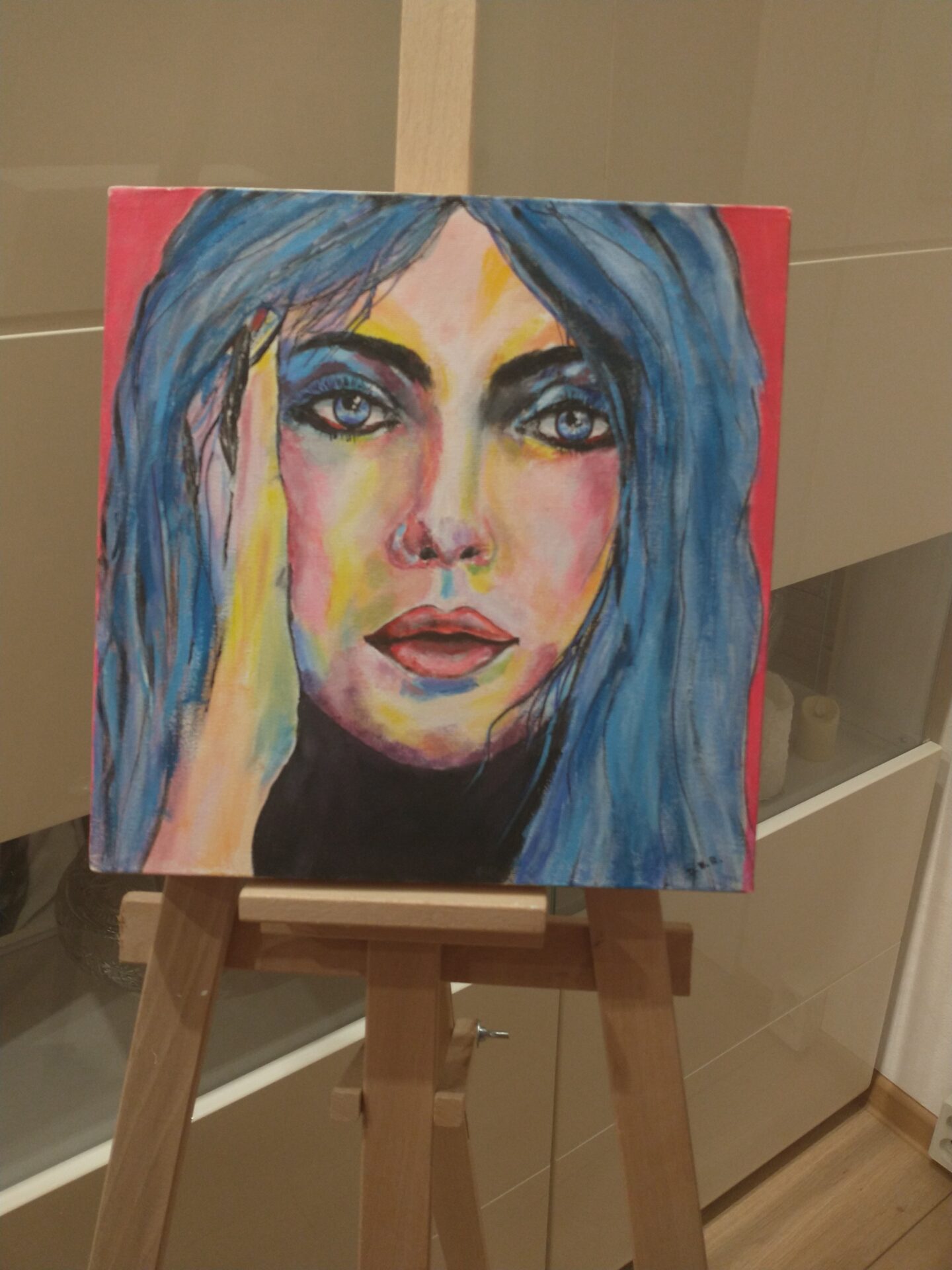 Obraz na płótnie , akryl, wymiary 30 x 30 x 3 /3D/, ramy białe, całość zabezpieczona werniksem. Zzmyślona nad przyszłością … Que sera?…