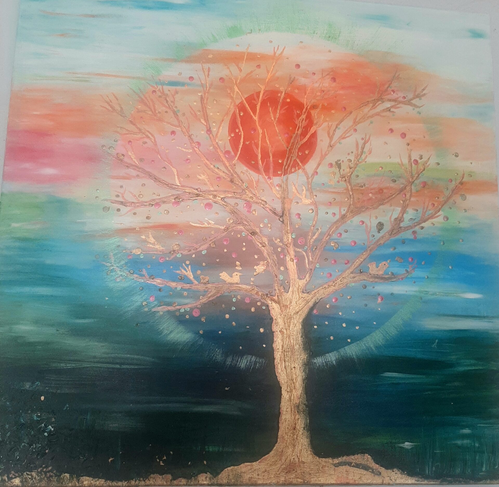 Obraz jest namalowany farbami akrylowymi na płótnie. Pień i gałęzie drzewa wykonałam posługując się złotym szlagmetalem. Wielkość płótna 60 x 60 cm