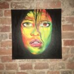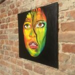 Jest to mój autorski obraz na płótnie o wymiarach 50×50 cm. Wykonany farbami akrylowymi. Przedstawia twarz kobieca w nienaturalnym wydaniu kolorystycznym. Dla kontrastu zastosowałam tło w kolorze głębokiej czerni.