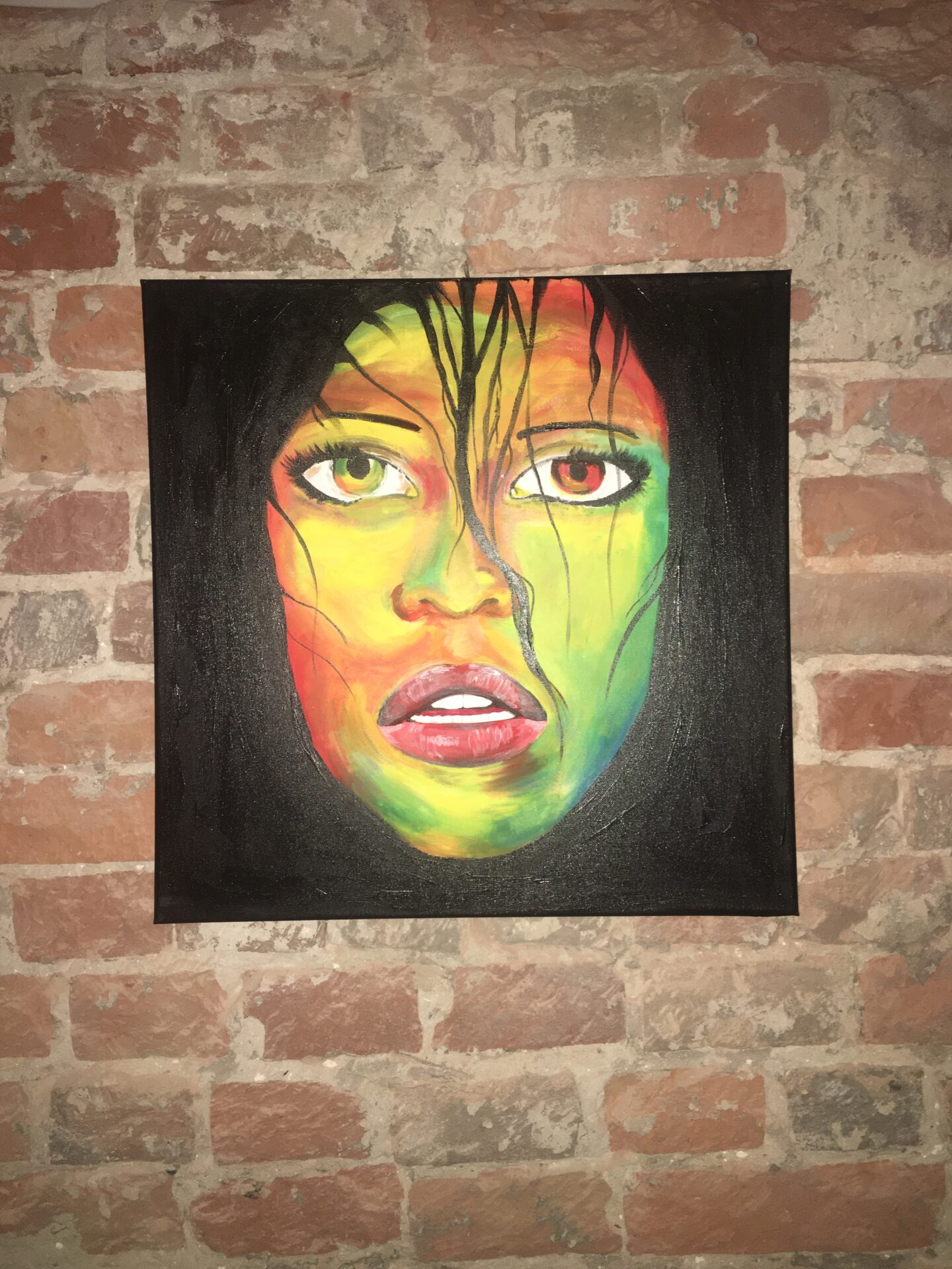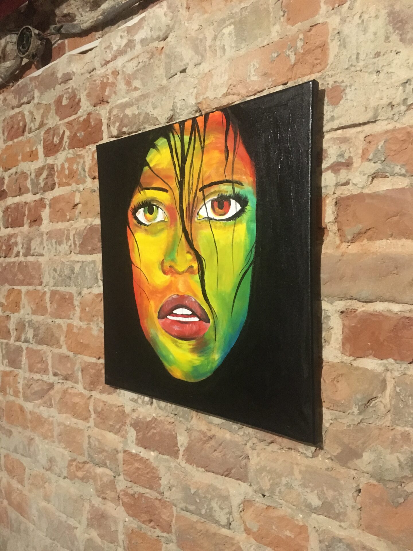 Jest to mój autorski obraz na płótnie o wymiarach 50×50 cm. Wykonany farbami akrylowymi. Przedstawia twarz kobieca w nienaturalnym wydaniu kolorystycznym. Dla kontrastu zastosowałam tło w kolorze głębokiej czerni.
