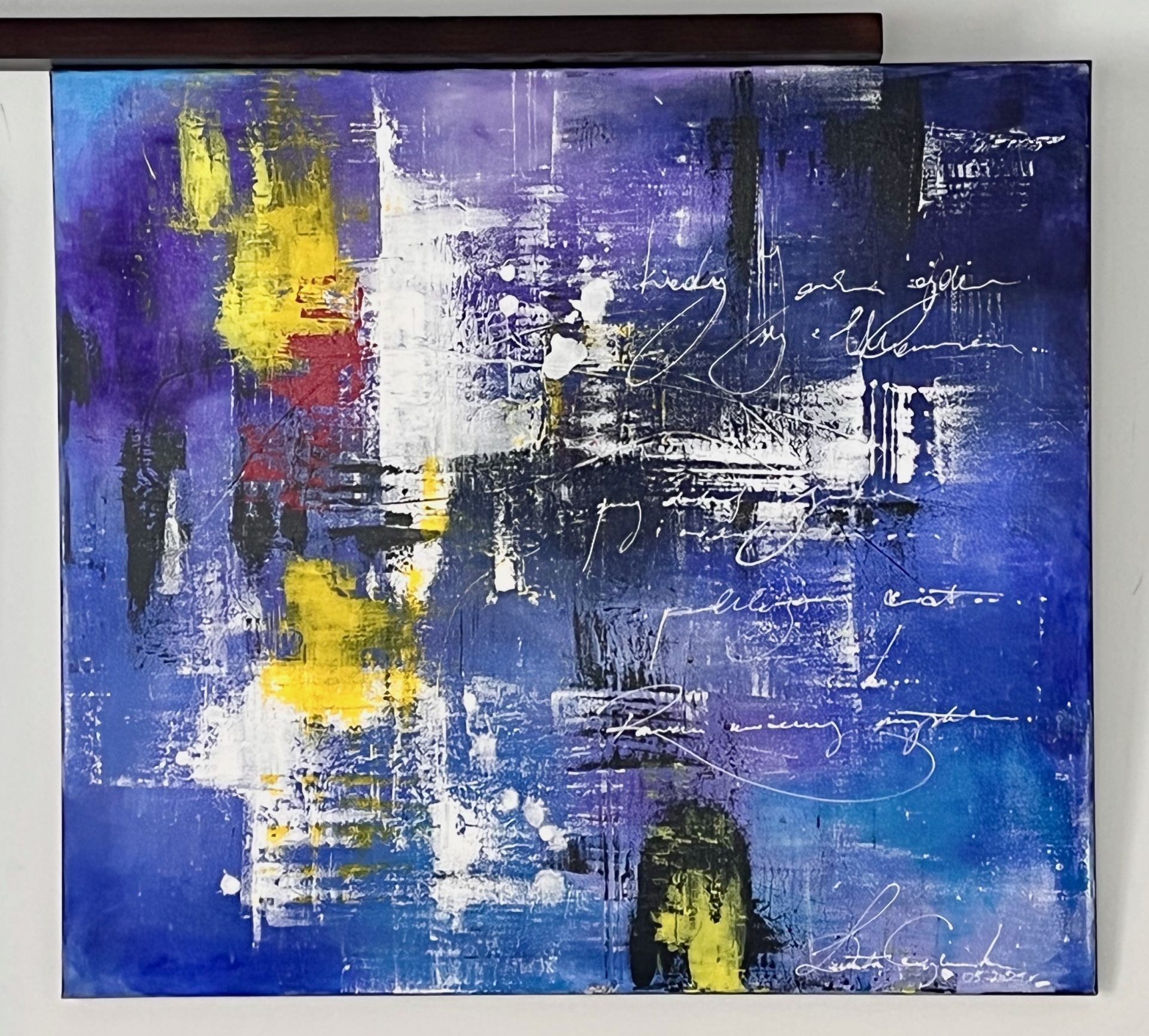 Abstrakcja współczesna, kolorystyka niebieski-granat-biel, akryl na płótnie.