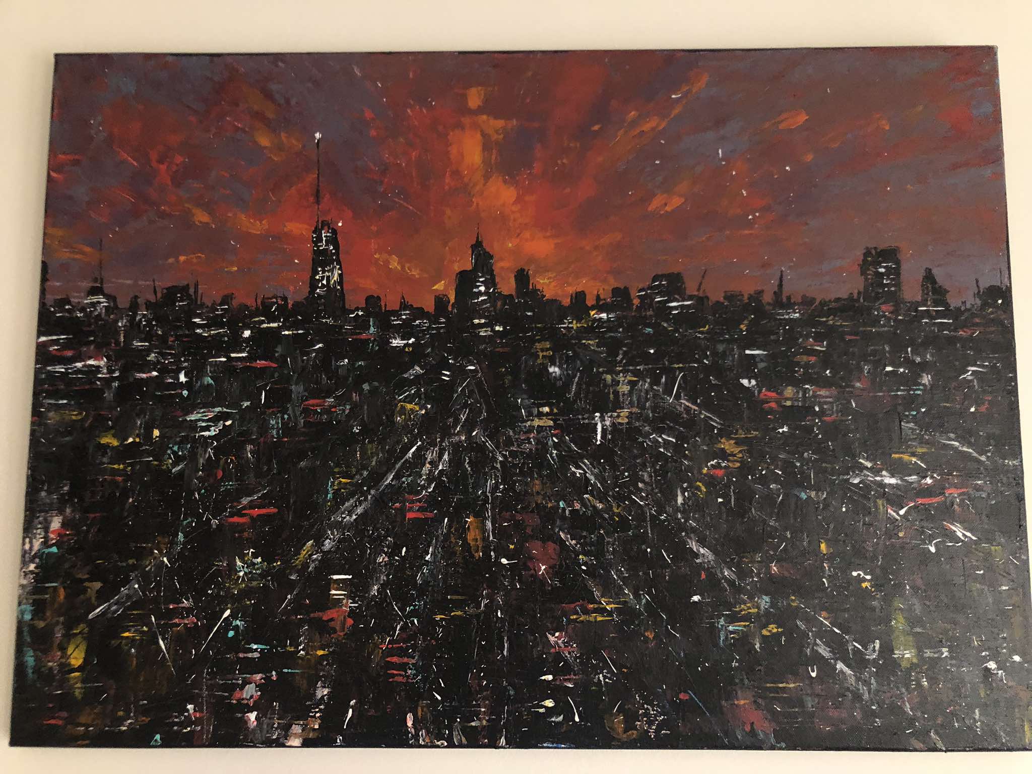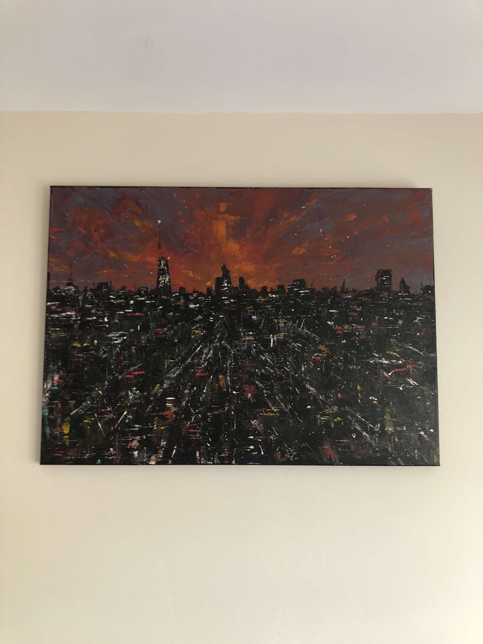 Obraz malowany ręcznie szpachelkami, farbami akrylowymi na bawełnianym płótnie dobrej jakości. Obraz przedstawia wizję miasta oraz świecących od niego świateł. Z daleka możnaby żec, że obraz jest pełen szczegółów :). Wykonany w 2024 roku, pomalowany ochronnym werniksem. Wykonany przezemnie, amatorską artystkę w napadzie weny. Zapraszam do kontaktu <3
