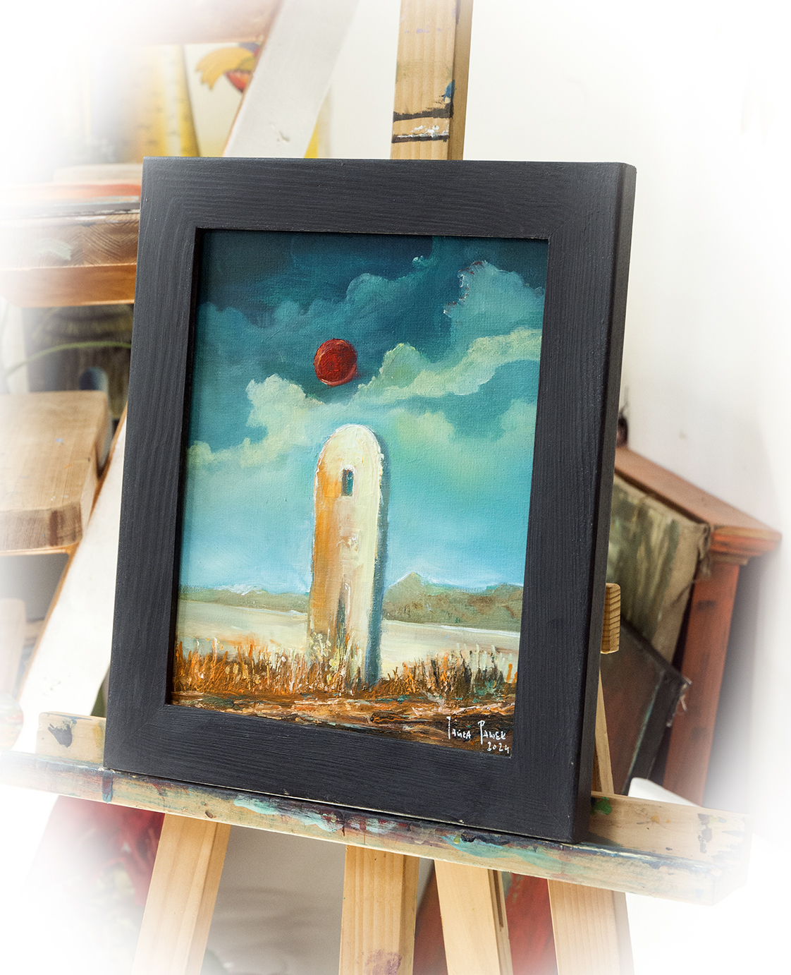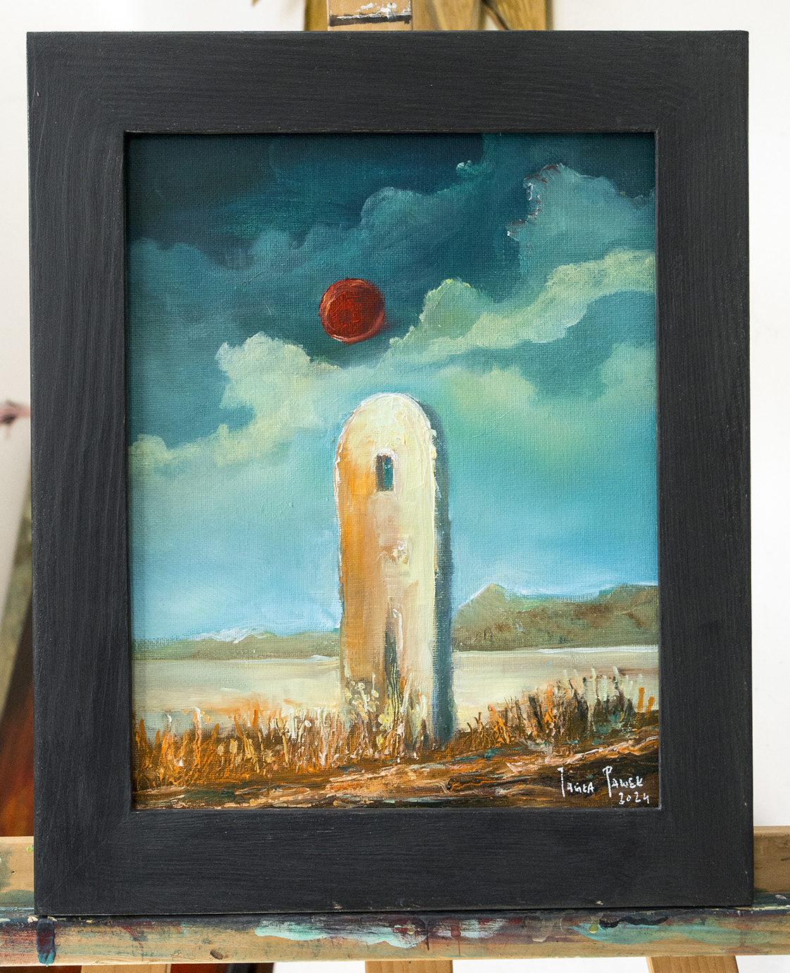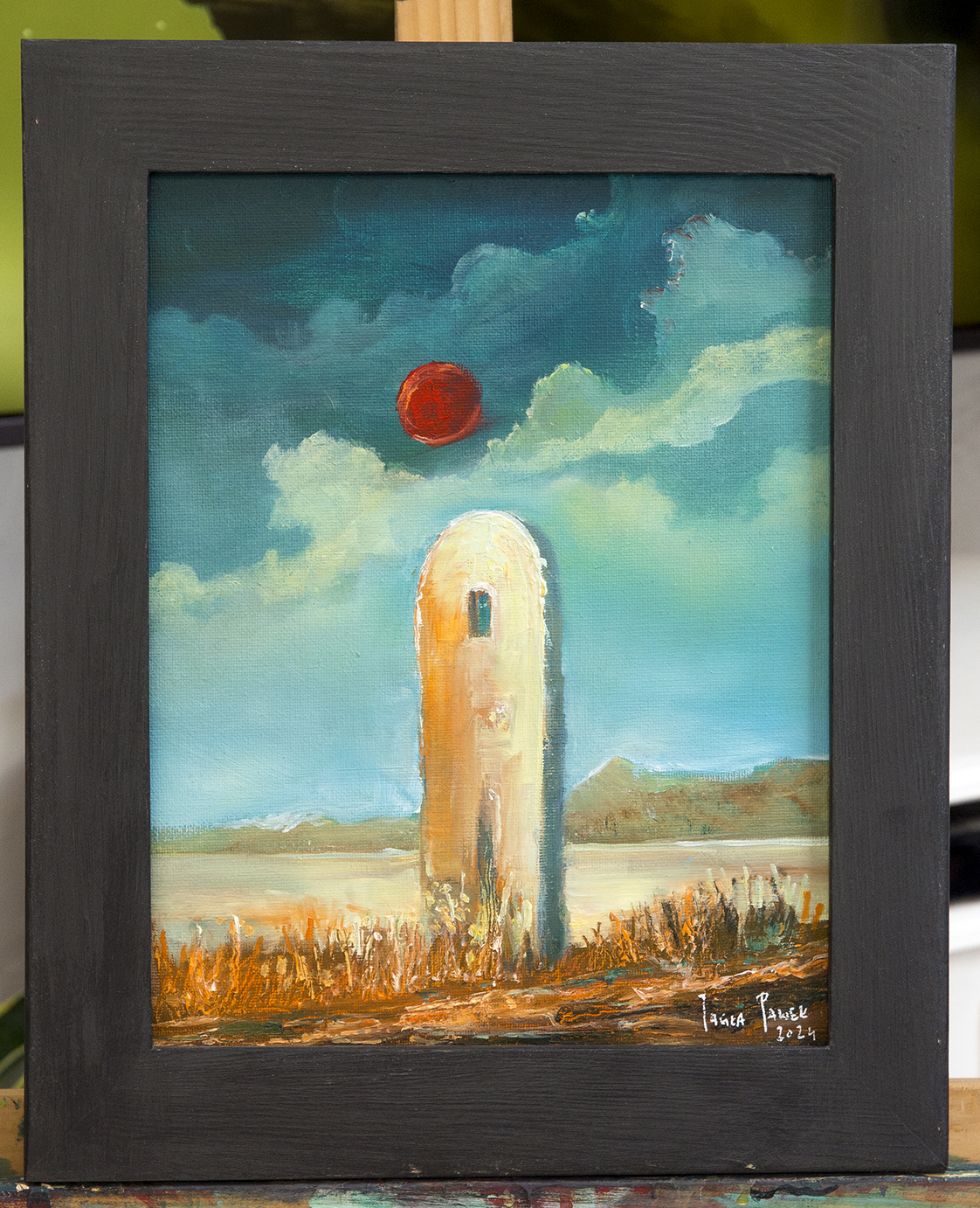 Obraz na płycie oklejonej płótnem bawełnianym 290gr/m2 , całość oprawiona w drewnianą ramkę 39×29 cmFarby olejne Renesans wymiar samej pracy 24×30 cm Praca sygnowana z tyłu i przodu .Certyfikat autentyczności