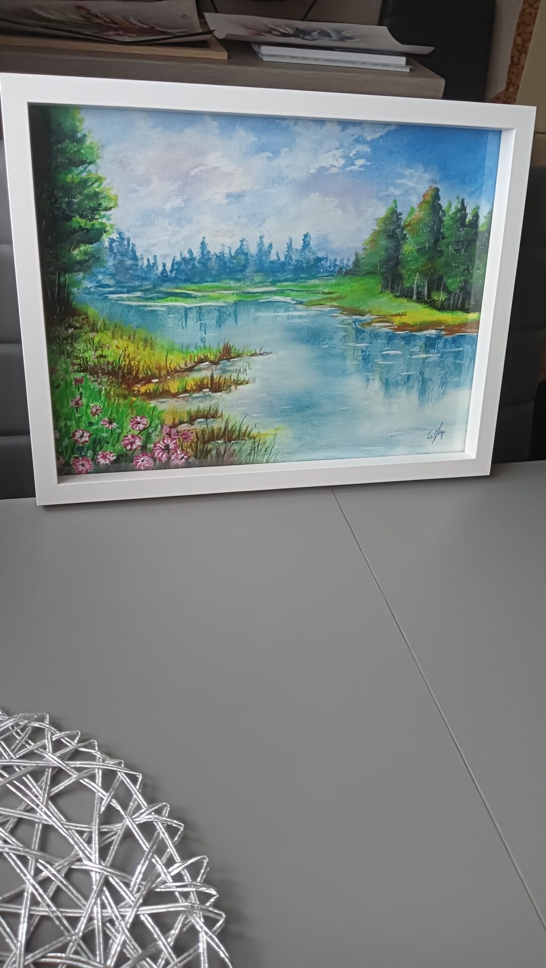 Krajobraz przedstawia jezioro otoczone zielenią drzewami i trawami Cisza i spokój nad jeziorem wśród traw przypomina nam o konieczności relaksu i wypoczynku naładowaniem baterii by pełnym werwy wrócić do codzienności