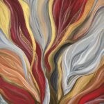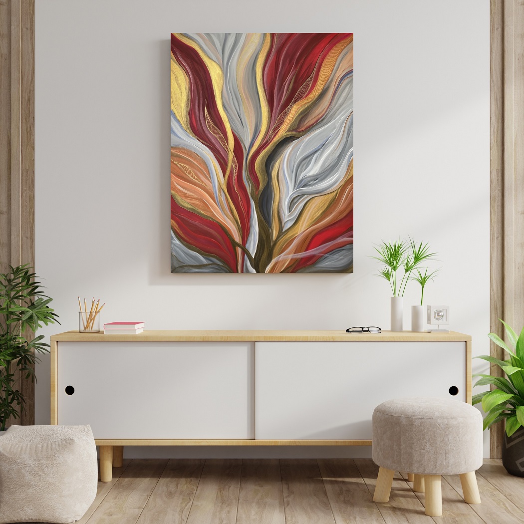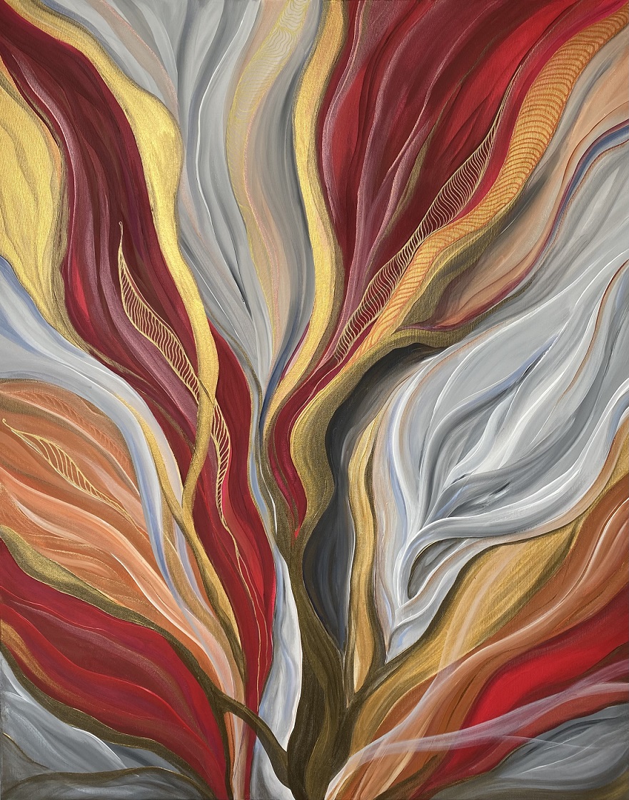 Falujące i przenikające się nawzajem kształty i kolory, niczym rośliny kołysane przez spokojne wody. Abstrakcja w intensywnych, wyrazistych kolorach rubinu, szarości i złota, malowana akrylami na płótnie o wymiarach 80×100 cm. Boki obrazu zamalowane dzięki czemu nie wymaga dodatkowej oprawy, zabezpieczony satynowym werniksem. Ozdobi i ożywi każde wnętrze, salon, sypialnię czy biuro.