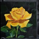 Obraz przedstawia żółtą różę,która symbolizuje przyjaźń,solidarność radość oraz chęć niesienia pomocy.Obecne czasy,w których doświadczamy wojny na Ukrainie,są też momentami wielkiej empatii i miłości.Czarne tło symbolizuje zło,które często ogarnia świat.