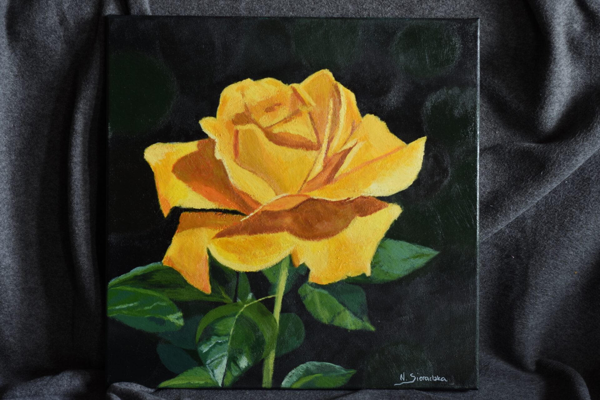 Obraz przedstawia żółtą różę,która symbolizuje przyjaźń,solidarność radość oraz chęć niesienia pomocy.Obecne czasy,w których doświadczamy wojny na Ukrainie,są też momentami wielkiej empatii i miłości.Czarne tło symbolizuje zło,które często ogarnia świat.