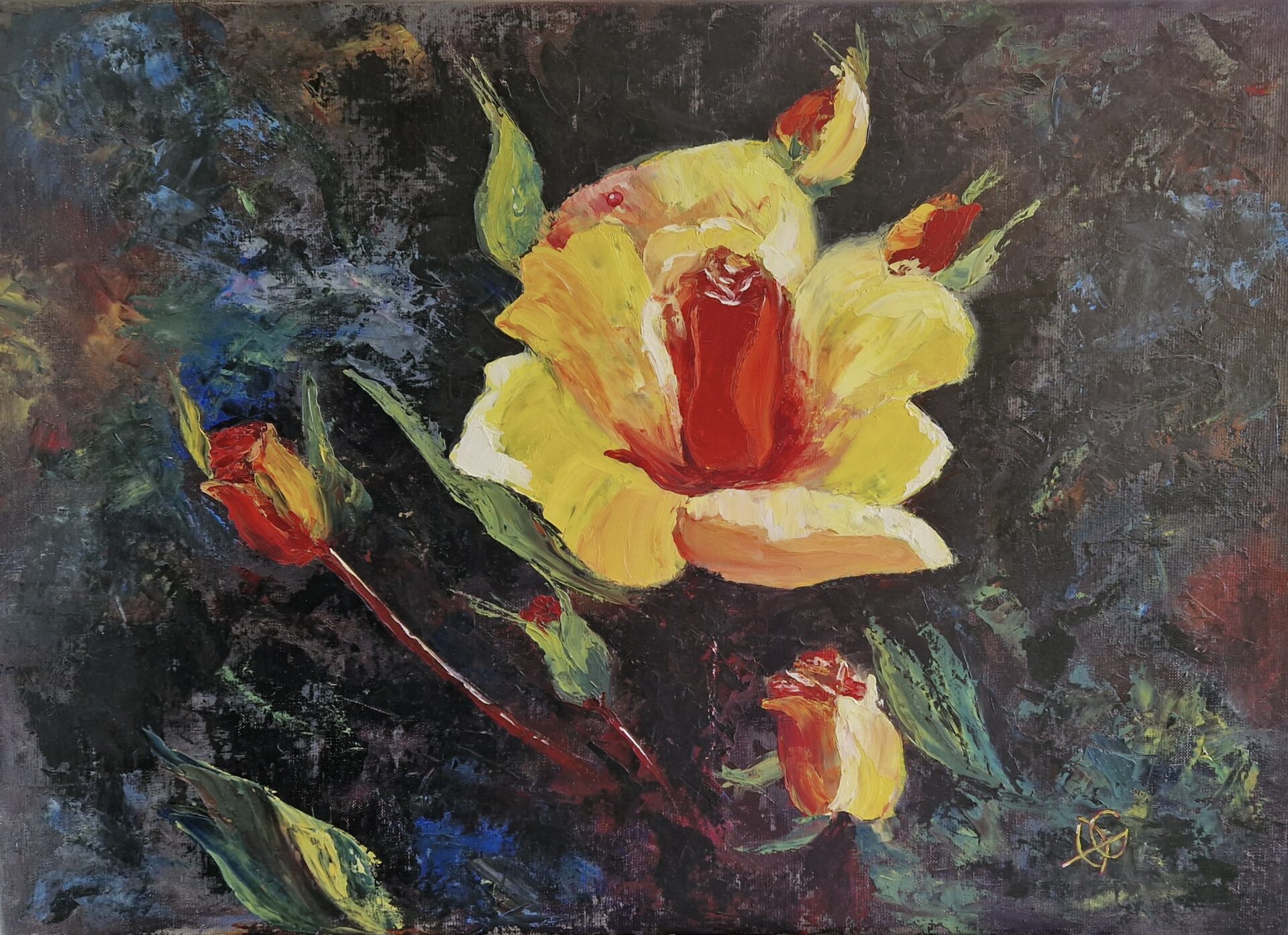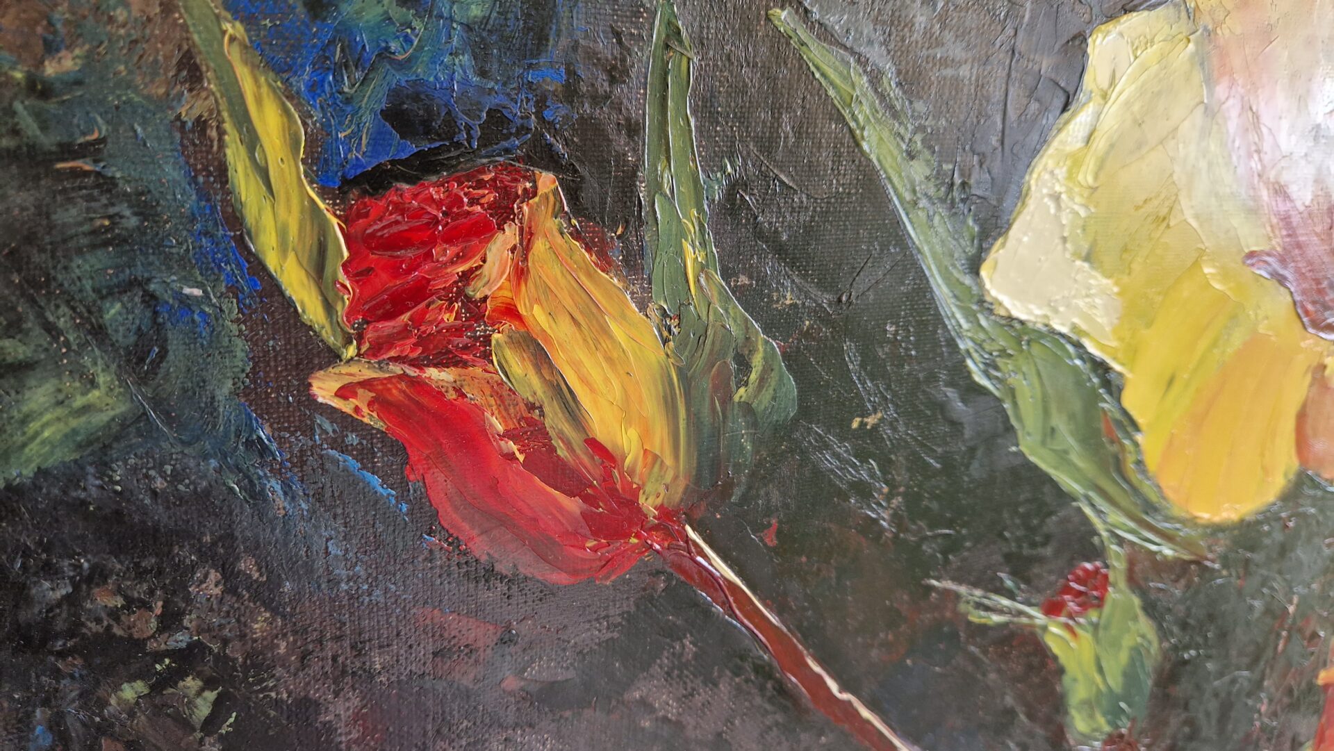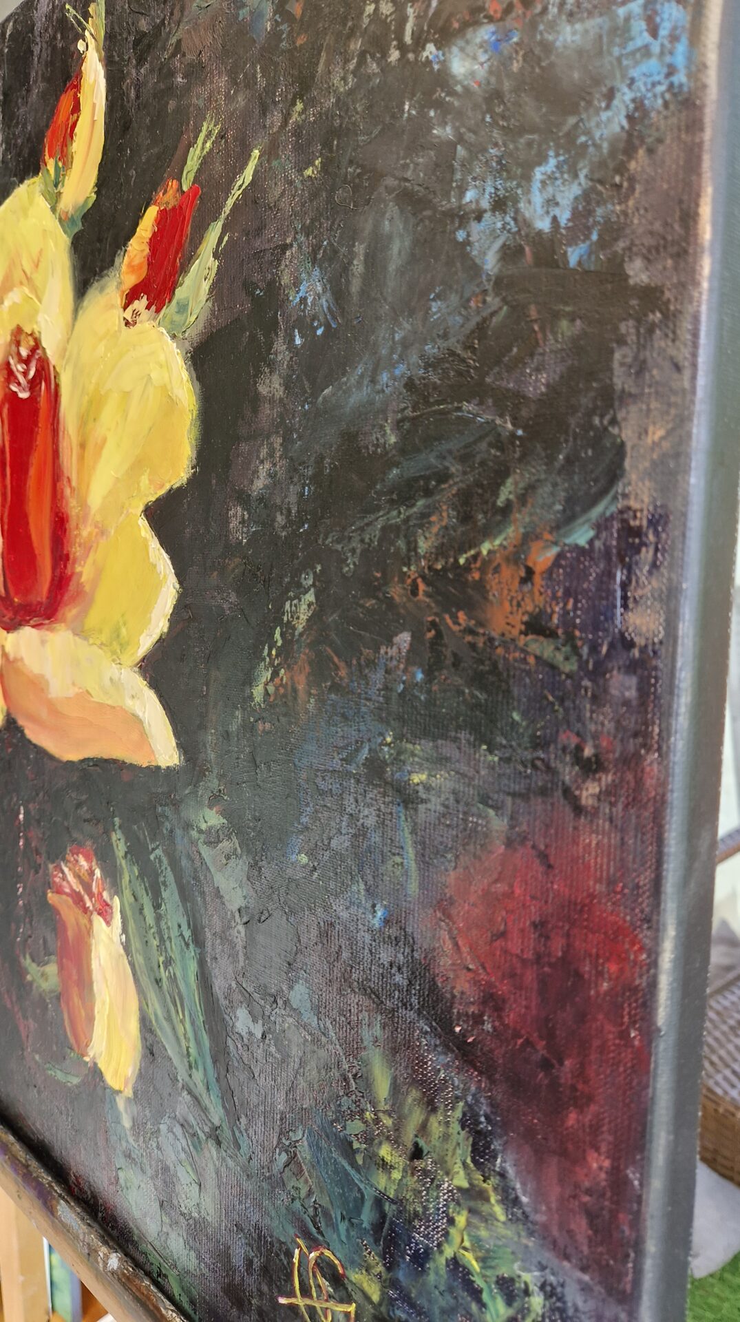 Obraz ma wykończone boki, zawerniksowany, na lnianym podobraziu, bez ramy, sygnowany. Termin wysyłki 2-4 dni.