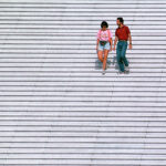 Fotografowałem aparatem małoobrazkowym Pentax ME Super z obiektywem SMC Pentax M 80-200 mm f/4.5, na negatywowym filmie kolorowym Kodak. Zdjęcie zrobione zostało z dużej odległości obiektywem ustawionym na najdłuższą ogniskową. Skutkiem takiego ustawienia obiektywu aparatu, schody straciły zostały na zdjęciu przestrzenność, zostały spłaszczone, odrealnione a przez to stały się intrygującym tłem dla pary młodych osób. Negatyw zdjęcia został zeskanowany, wydruk z pliku cyfrowego. Wydruki nie są limitowane.