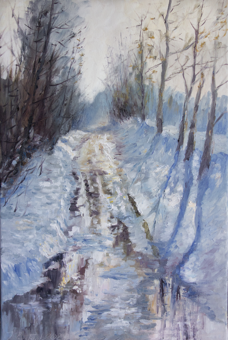 Obraz olejny na podobraziu płóciennym w technice alla prima z widoczną fakturą farby