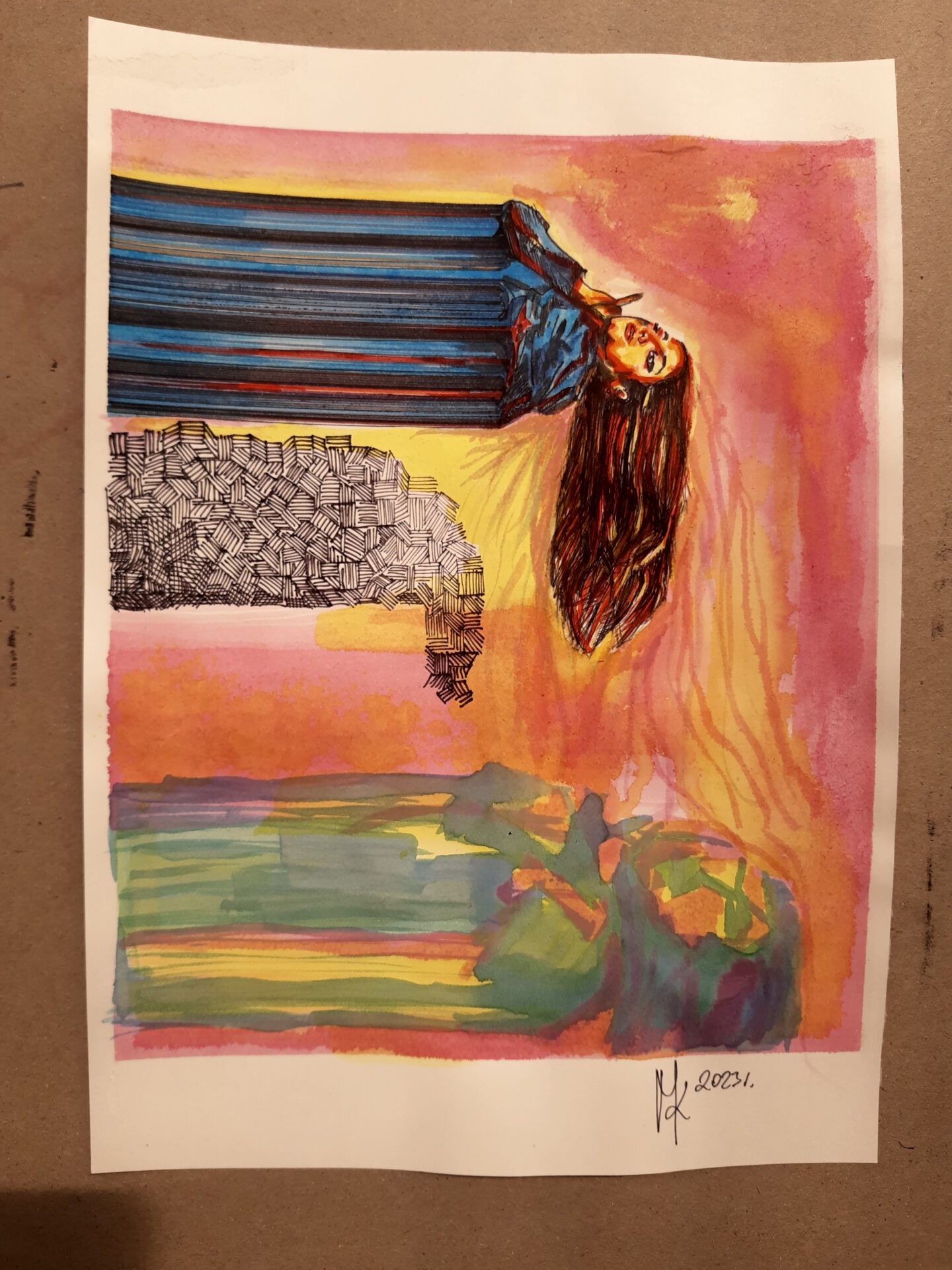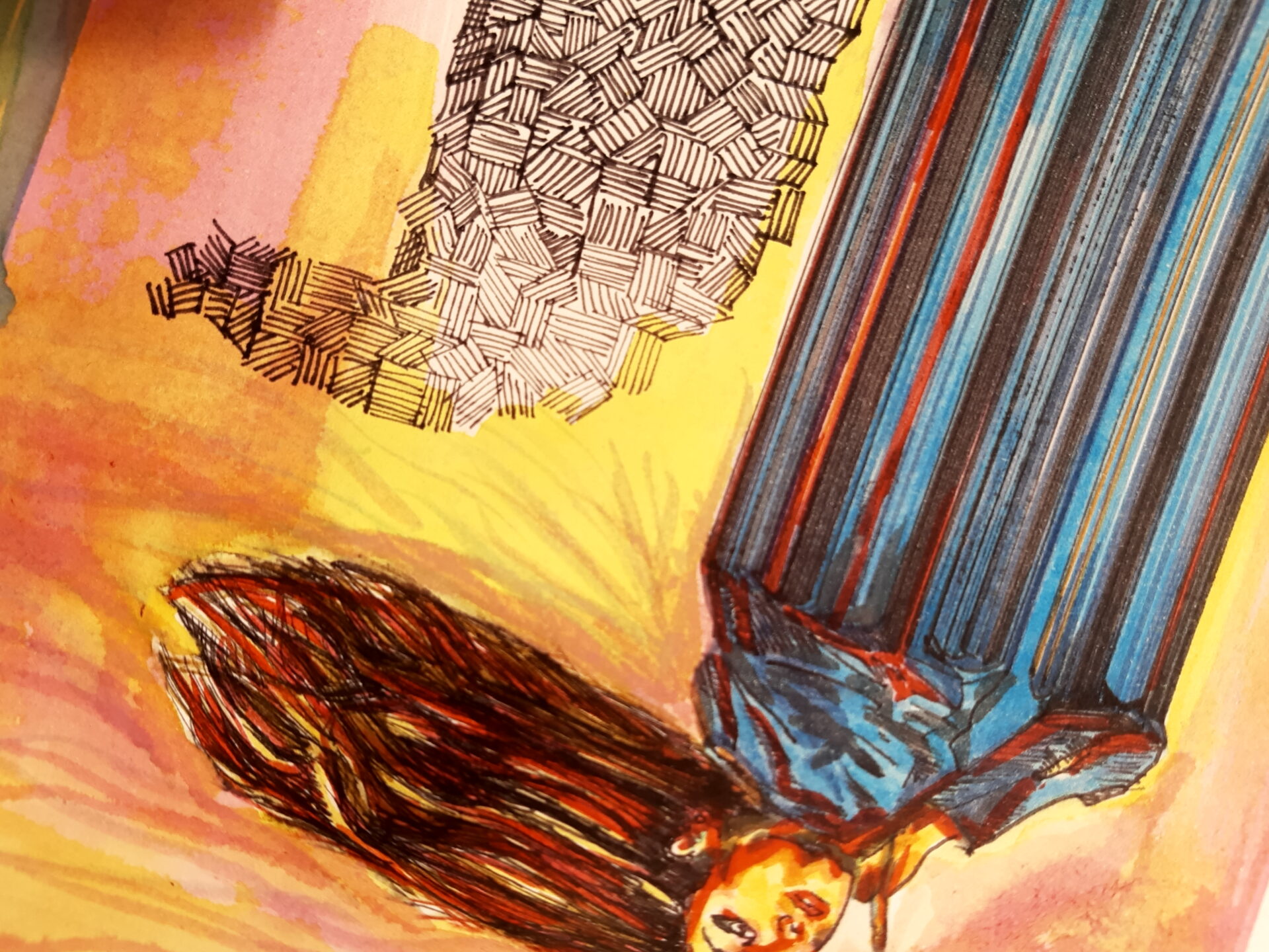 Rysunek wykonany tuszami wodnymi, wiecznym piórem i cienkopisem.