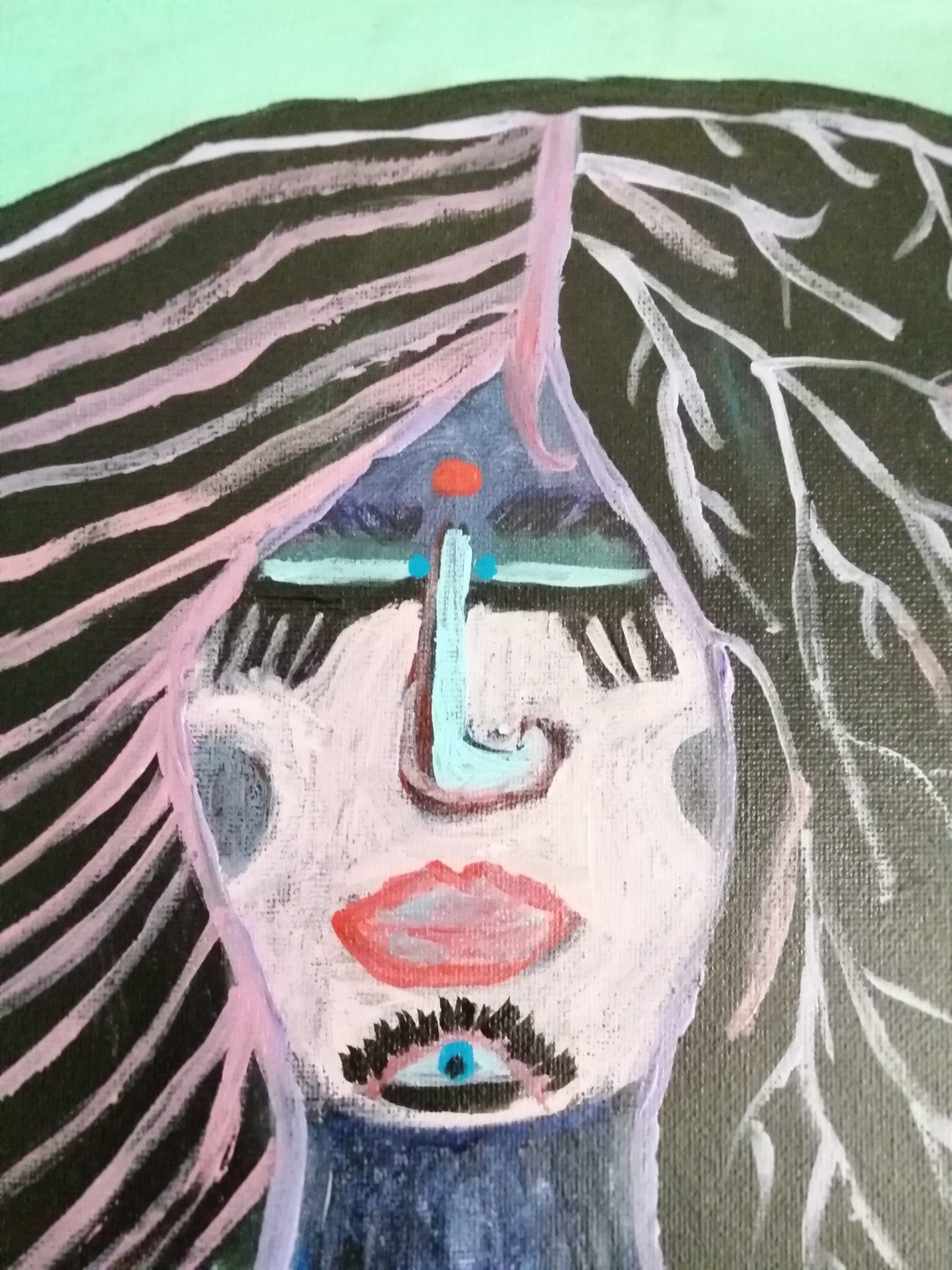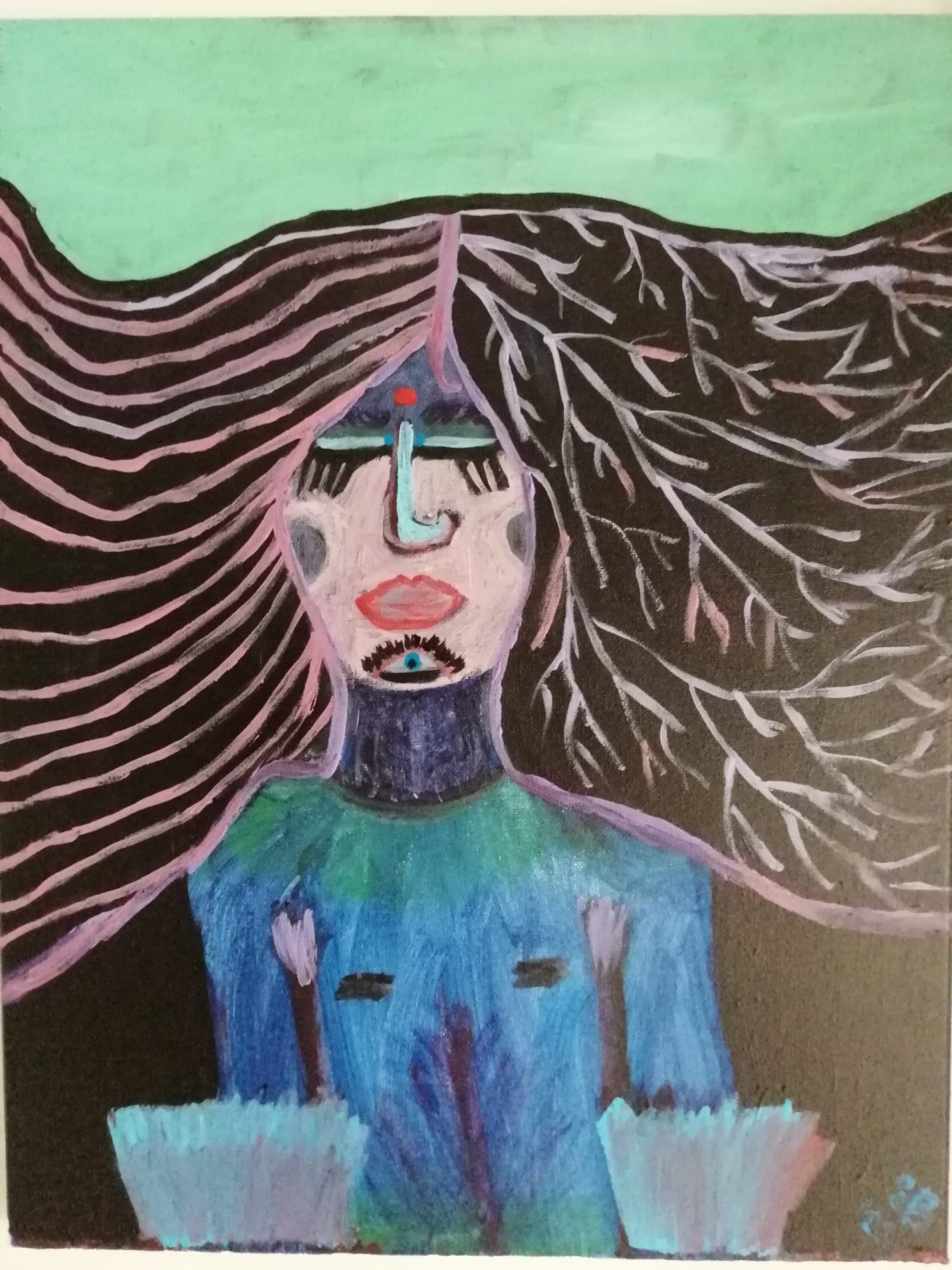 oniryczna postać, symbolika, pastelowe kolory kontrastujące z czarnym